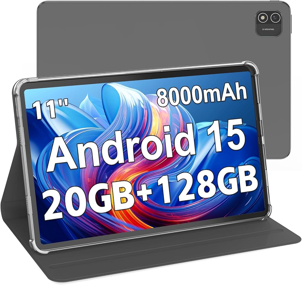 Android 15 Tablet, 11 Inch Tablet with 8000 mAh, Octa-Core, 20GB RAM 128GB ROM 1TB Expansion, 1920x1200, 5MP+8MP, 2.4G/5G WiFi, Support GMS GPS Face Unlock Parent Control, Case Included