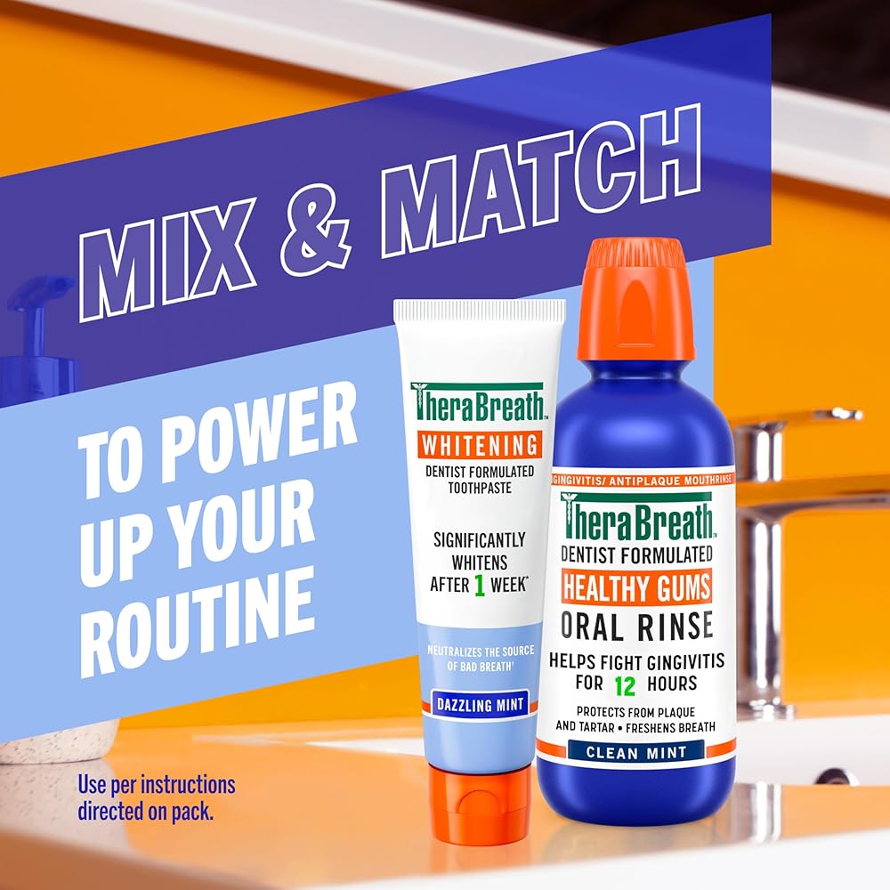 TheraBreath Whitening Mouthwash is tough on stains and bad breath but gentle on teeth. This whitening rinse helps remove stains while also forming a protective barrier that prevents future staining. Safe to use every day, TheraBreath Whitening Mouthwash is formulated without peroxide, which is commonly found in many whitening products and can lead to tooth sensitivity and discomfort. Like all TheraBreath mouthwashes, our Whitening Mouthwash is dentist-formulated with powerful breath freshening ingredients. The alcohol-free formula doesn't burn or irritate, and the Dazzling Mint flavor is gentle and refreshing. We're so confident in the effectiveness of TheraBreath Oral Rinses that we back them up with our 100% guarantee. If you're not satisfied, contact us within 30 days of purchase for a full refund. TheraBreath: It's a better mouthwash, satisfaction 100% guaranteed!