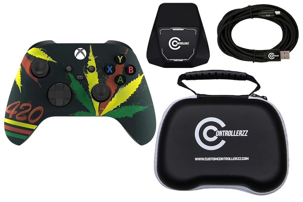 Upgrade your setup with the ultimate all-in-one gaming bundle from Custom Controllerzz. This complete set includes a brand new 420 Custom Wireless Controller for Xbox Series X/S, Xbox One, & PC. Additionally, includes a durable 9ft braided USB-C cable, controller stand, and a universal travel case to keep your controller protected wherever you go or when not in use. Every controller is made from a genuine Microsoft Series X/S controller base, customized with our exclusive custom designs. Whether you're gaming on Xbox Series X/S, Xbox One, or PC, this bundle delivers the comfort, control, and style serious gamers expect. Enjoy tangle-free charging, secure storage, and next-level aesthetics—all in one box. It's everything you need to take your gaming experience to the next level.