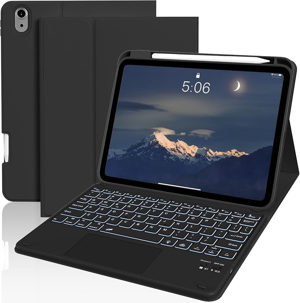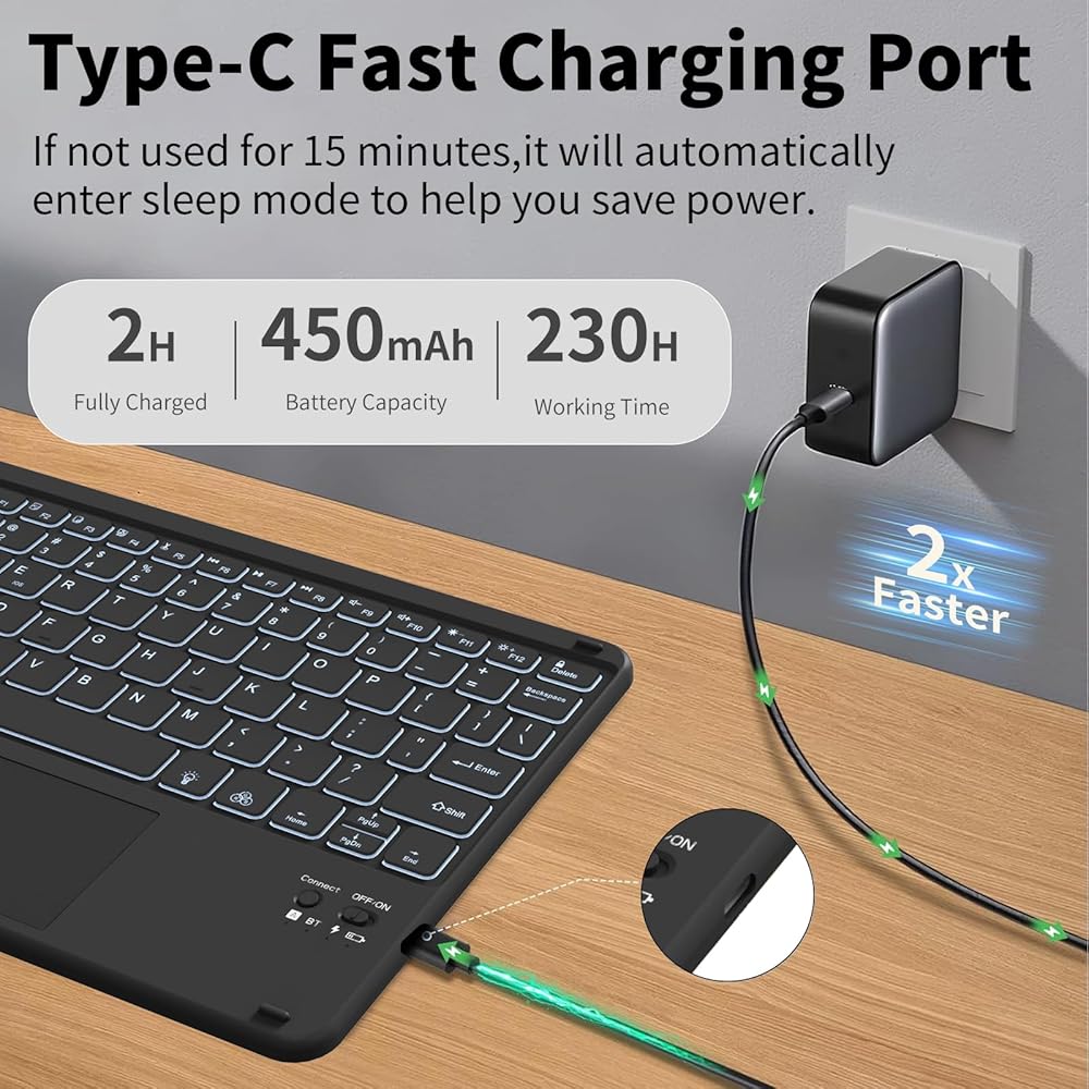 【Detachable Magnetic Keyboard with 7-Color Backlight】 Features a wireless Bluetooth keyboard with magnetic attachment/detachment functionality. Customizable 7-color RGB backlight with 3 brightness levels enables comfortable typing in low-light environments.You can choose your favorite color, bringing you different visual enjoyment. Ergonomic and mechanical scissor keys with rebound feature to reduce noise, enjoy comfortable typing even long hours