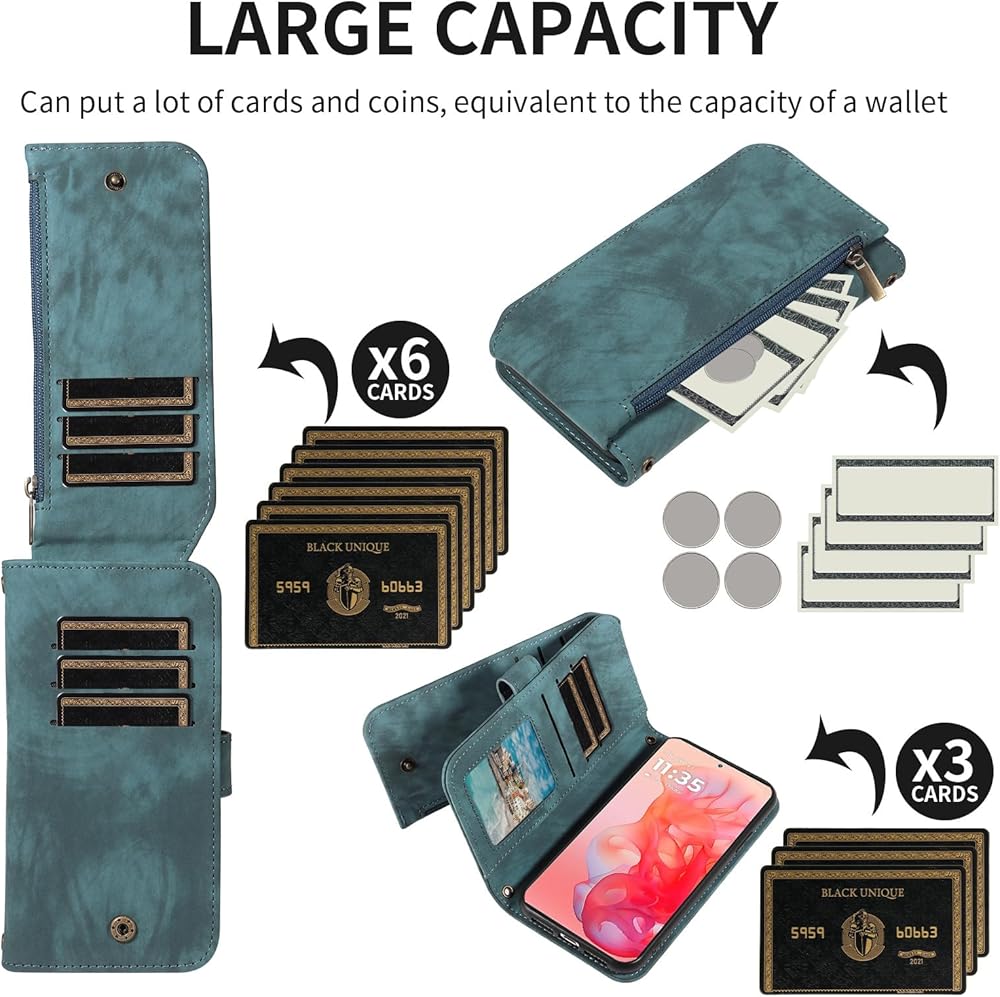 【Wallet & Kickstand】: This case includes 9 card slots + 1 cash slot + 1 zipper bag,hold your ID,credit cards,driver license,bills,coins,key and a little bit cash without problems. Foldable kickstand is convenient for reading, watching movies/TV, playing games, browsing the web and face-to-face chatting with friends, it works excellent both in vertically and horizontally.