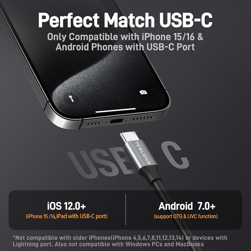 USB C Endoscope Camera with Light, Teslong Type-C Snake Borescope Camera with 8 LED Lights, 10FT Flexible Waterproof Inspection Cam, Fiber Optic Scope Compatible with iPhone 15/16/17, Android Phone