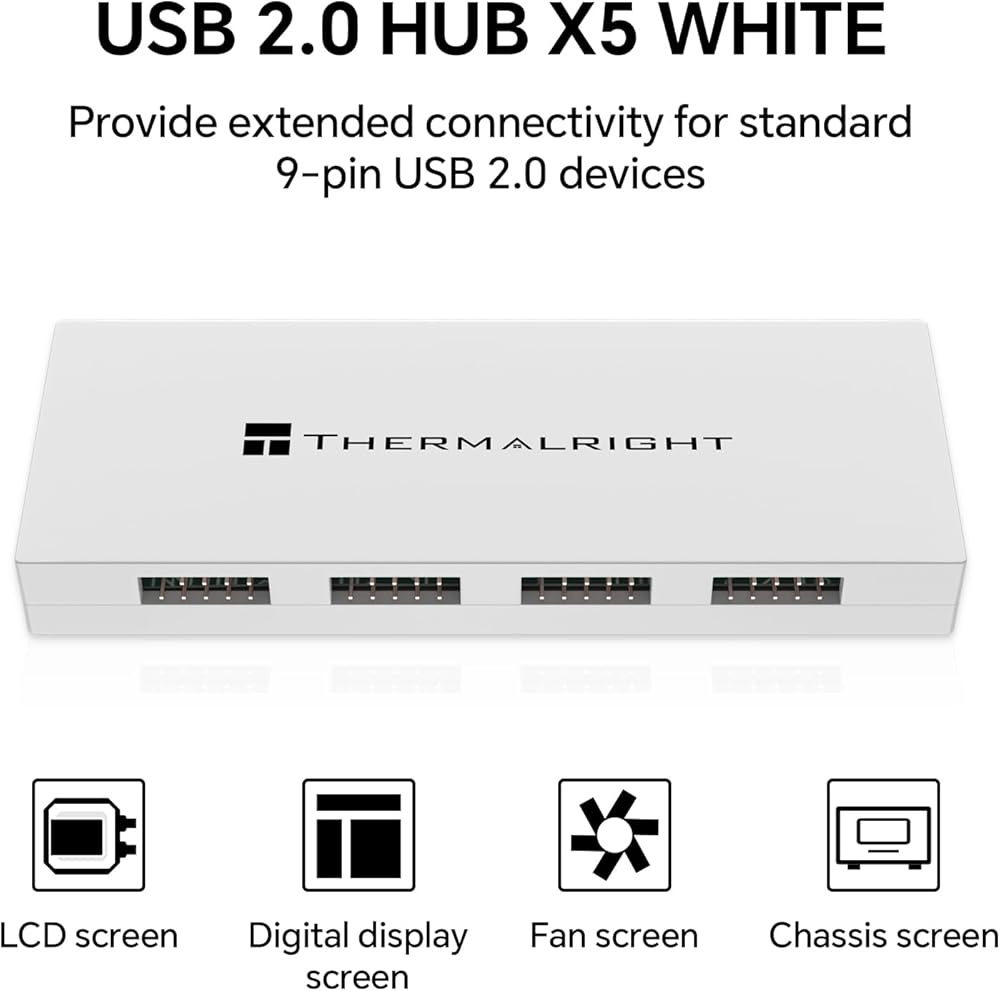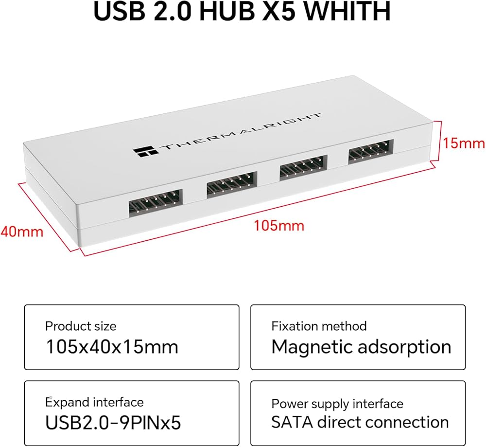 Internal USB 2.0 Hub X5 - Expands to 5 9-pin USB 2.0 Ports, SATA Power Connection, Magnetic Mount, Suitable for PC motherboards (White)