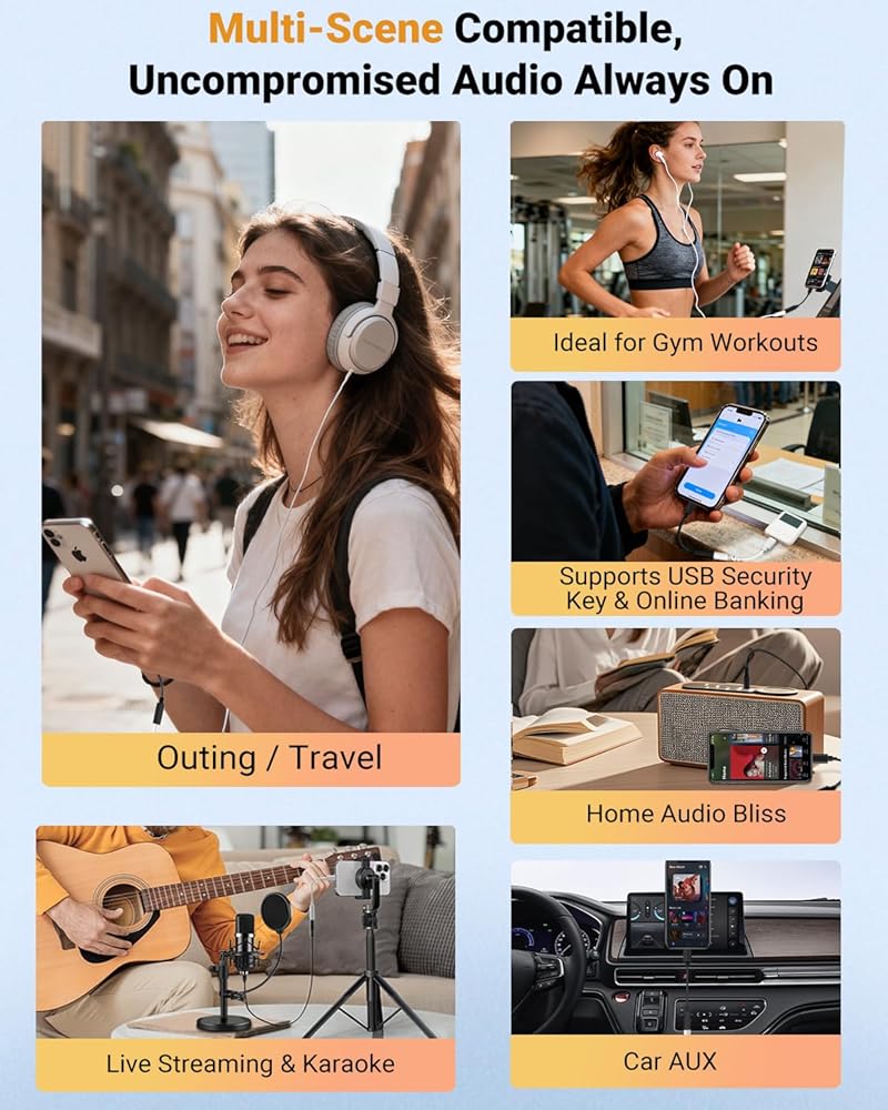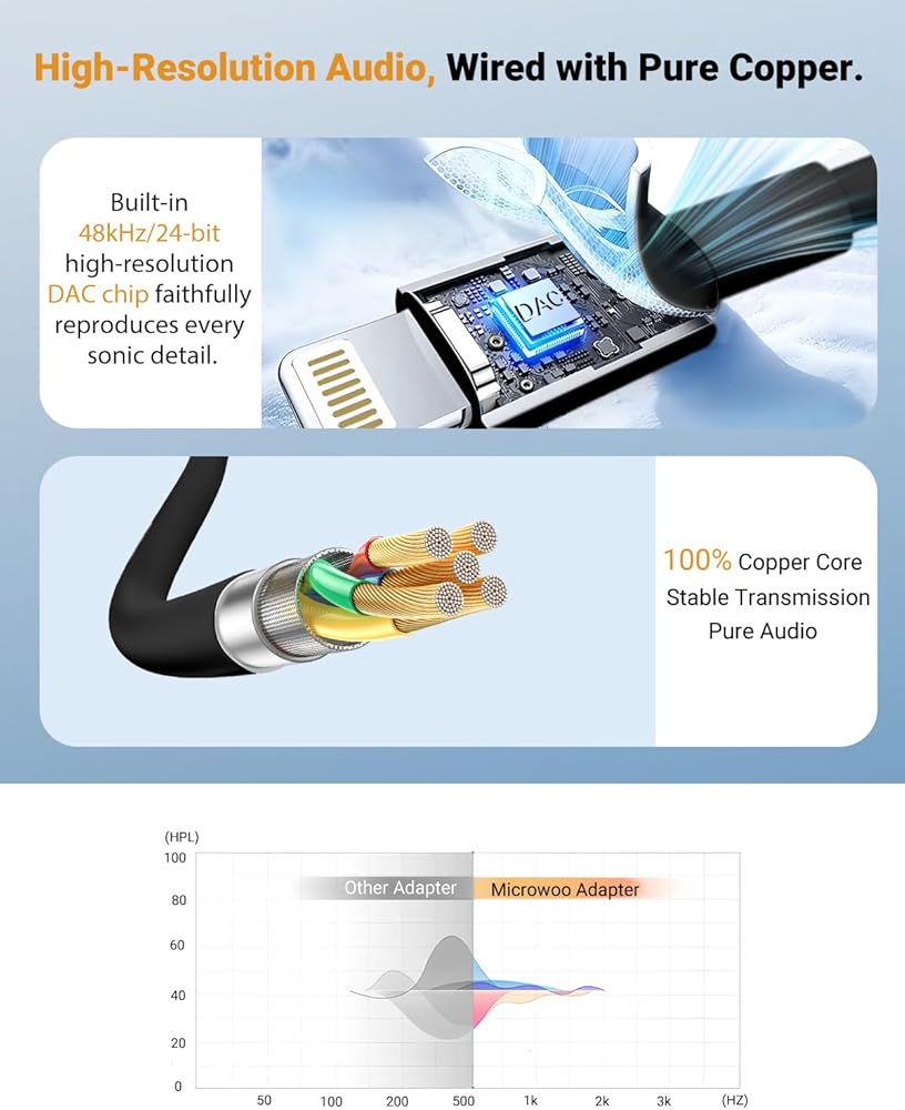 【Hi-Fi Stereo Sound – Studio-Quality Audio on the Go】Microwoo apple lightning to 3.5mm adapter with a 48kHz/24-bit DAC chip, delivering deep bass, smooth mids, and crisp highs—ideal for music lovers, podcast listeners, and gamers. Experience crystal-clear audio, hear every detail just as the artist intended