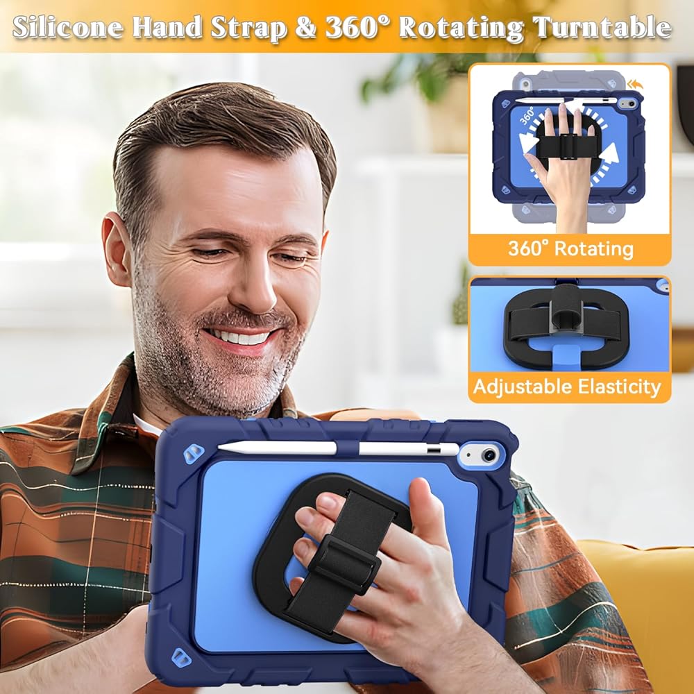 Grifobes for iPad A16 11th/10th Generation Case 2025/2022, for 11 Inch/10.9 Inch iPad Case Cover with Screen Protector, 360°Rotate Stand, Hand & Shoulder Strap, Pencil Holder, Navy Blue