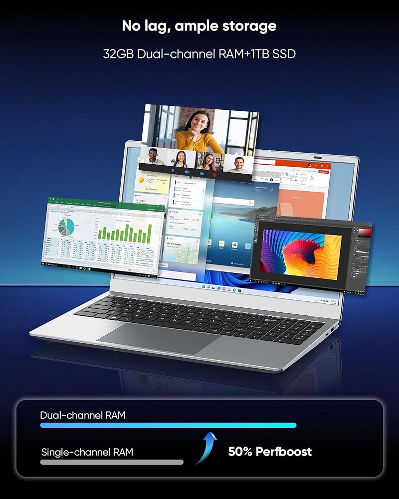 [ 32GB Dual-Channel RAM: Blazing-Fast Multitasking Power ] Unlike most laptops with 8GB/16GB RAM, our ECOHERO laptop is equipped with 32GB high-speed dual-channel RAM—double the capacity for seamless performance. It effortlessly handles dozens of browser tabs, large Excel spreadsheets, and simultaneous Office app use without lag, making it a top choice for busy professionals and students.