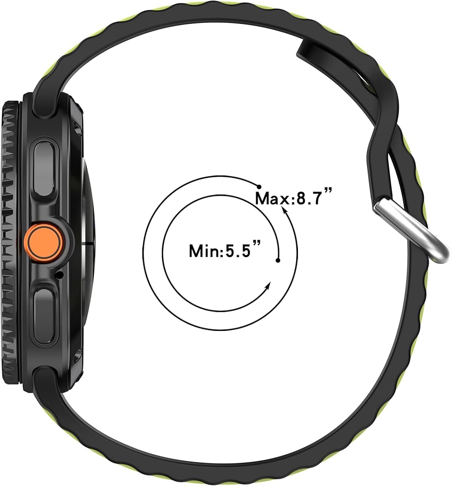 Wrist Size: The Galaxy Watch Ultra 7 2025/Galaxy Watch 8 LTE 40mm 44mm Band (2025) / Galaxy Watch 8 Classic LTE 46mm strap is adjustable and fits wrists from 5.5-8.7 inches (140-220 mm). The sport strap has a lugless design that blends seamlessly into the body of the watch, ensuring a sleek look and comfortable fit, especially during intense exercise. The stainless steel buckle is lightweight and durable and holds the watch securely in place.