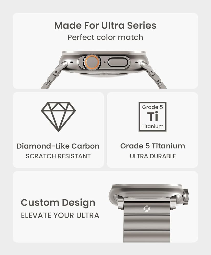 Exquisite Design with Premium Titanium Material: The FiNESTONE Titanium Apple Watch band is crafted from premium titanium. Diamond-like Carbon (DLC) coating for high corrosion & scratch resistance. At the same time, it is Waterproof and sweatproof, smooth hand feeling, which fits the skin without itching. The lightweight yet sturdy material adds a touch of sophistication and elegance to your wrist.