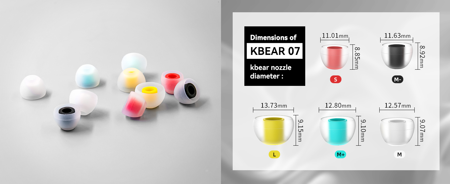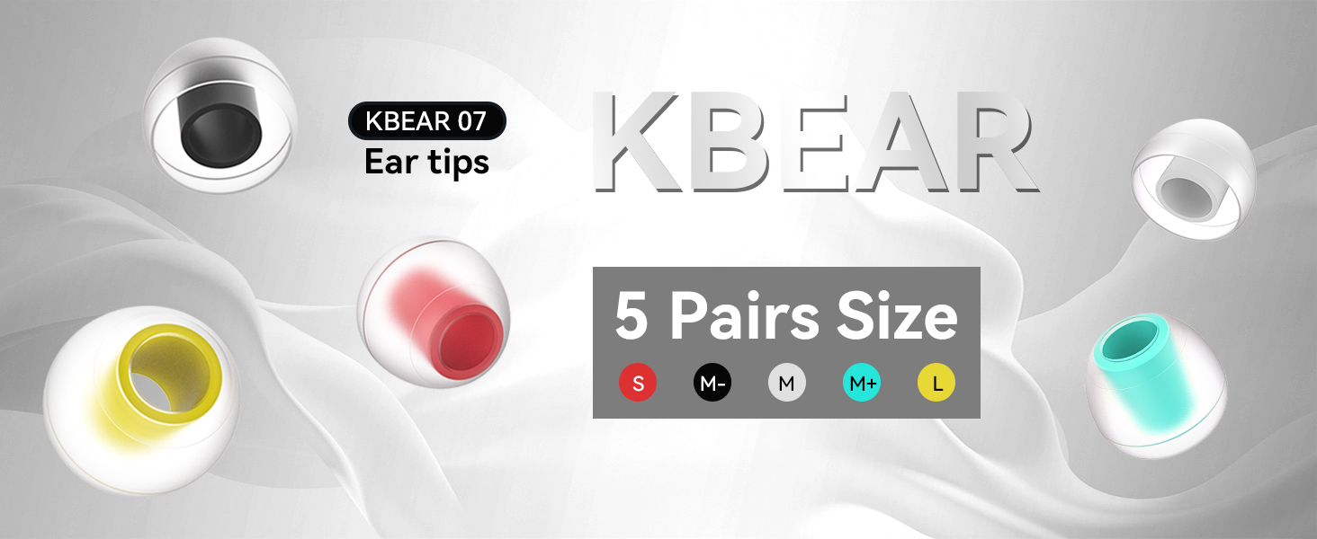【5 Pairs Different Size Silicone Earbud Tips, Broad Compatibility】KBEAR 07 ear bud rubber tips is equipped with 5 sizes of S, M-, M, M+, L, can meet your different needs. Users can choose the size of eartips that suits them best. Earphones with sound tube diameter from 4.5mm to 7mm can be used