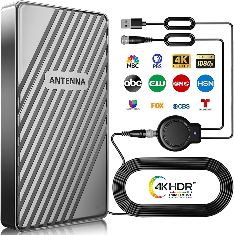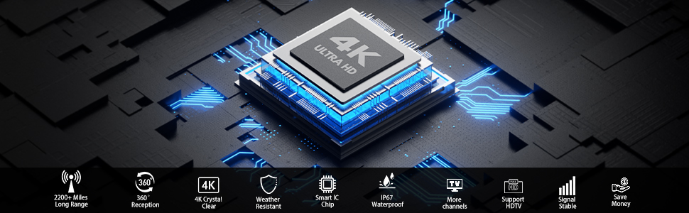 SUITABLE FOR BOTH OUTDOOR/INDOOR USE: This smart digital outdoor tv antenna is equipped with a 33ft ultra-long coaxial cable.With 360° ultra-strong reception capability perfect for use at home, in an underground garage, office, at an outdoor picnic, on an RV, on a yacht, and more. Its weather-resistant design guarantees stable 4K HDR signals, even during storms