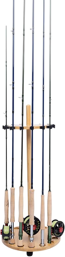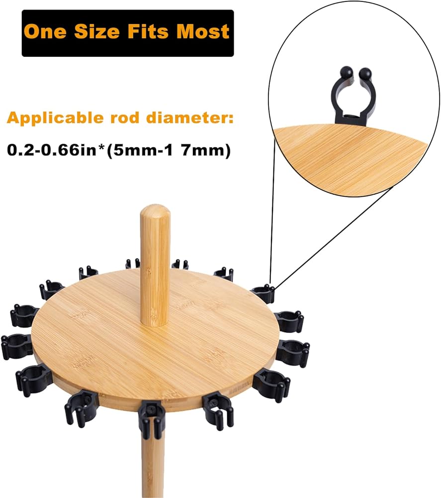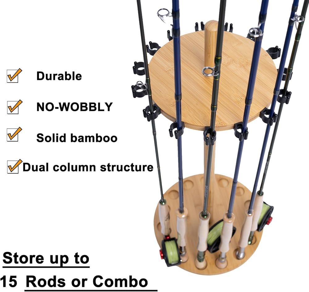 Crafted from 100% natural bamboo, this elegant and durable fishing rod stand organizes 8、 14 or 15 rods with rock-solid, wobble-free stability. Its smart design features soft rubber-tipped clips for easy access and effortless portability. It's the perfect storage solution and a thoughtful gift for any angler, designed to showcase gear beautifully in a garage, living room, or study.