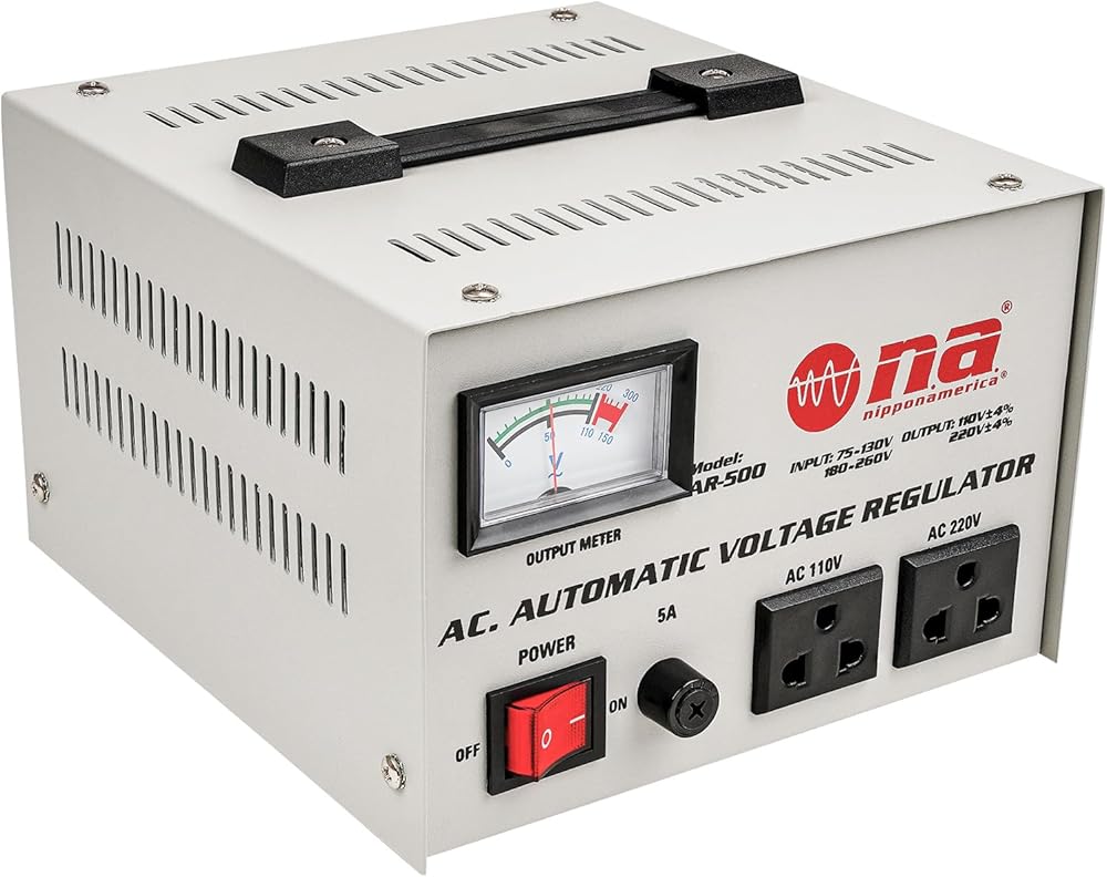 Nippon America AC Automatic Voltage Regulator (AR-500), 500 Watts, Delay Output Circuit, Display, AC 110V/120V, Power Switch, High-Voltage Protection, Efficient Heat Dissipation, Handle, Single Phase