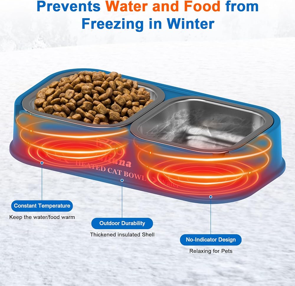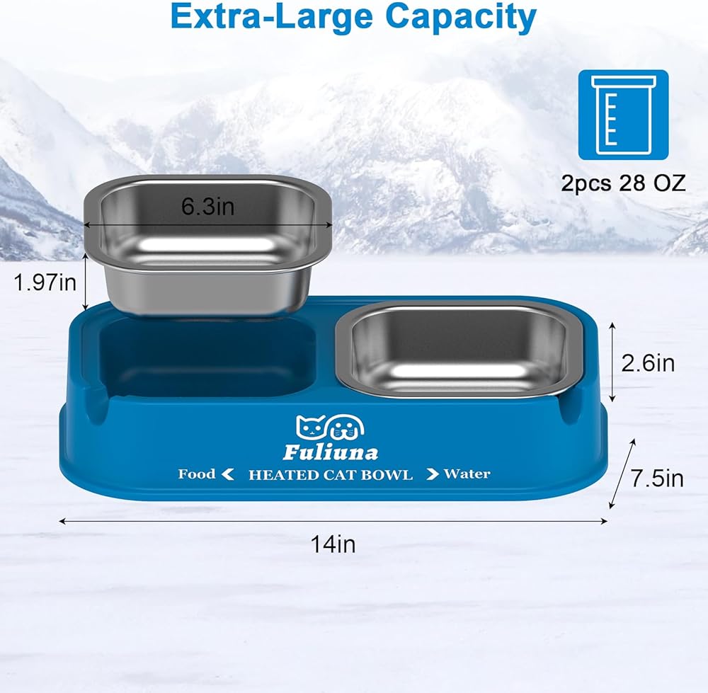 【Extra-Large Capacity】The outer shell of heated water bowl for outdoor cats is made of durable, cold resistant pp material, providing a safe drinking environment for animals. Features double stainless steel bowls design, with each bowl holding 28 OZ, allowing you to provide water and food at the same time. It reduces the need for frequent refills, offering you convenience. The two detachable stainless steel bowls are easy to clean and can be washed by hand or in the dishwasher.