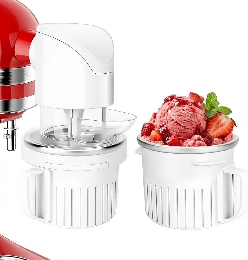 UNLEASH YOUR FROZEN CREATIVITY - Make Any Treat Imaginable: Beyond simple ice cream, this versatile ice cream attachment for kitchenaid and its two kitchen aid bowls for mixer open up a world of frozen possibilities! Easily create refreshing sorbets, rich gelatos, healthy frozen yogurts, non-dairy options, and more. Experiment with endless mix-ins and flavors using this indispensable kitchen aid accessory for your kitchen aid mixer.