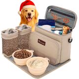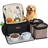 All-in-One Travel Kit:Your complete solution for on-the-go care. The set includes: 1 durable dog bag, 2 portable food containers, 2 collapsible bowls, and 1 water-resistant feeding placemat