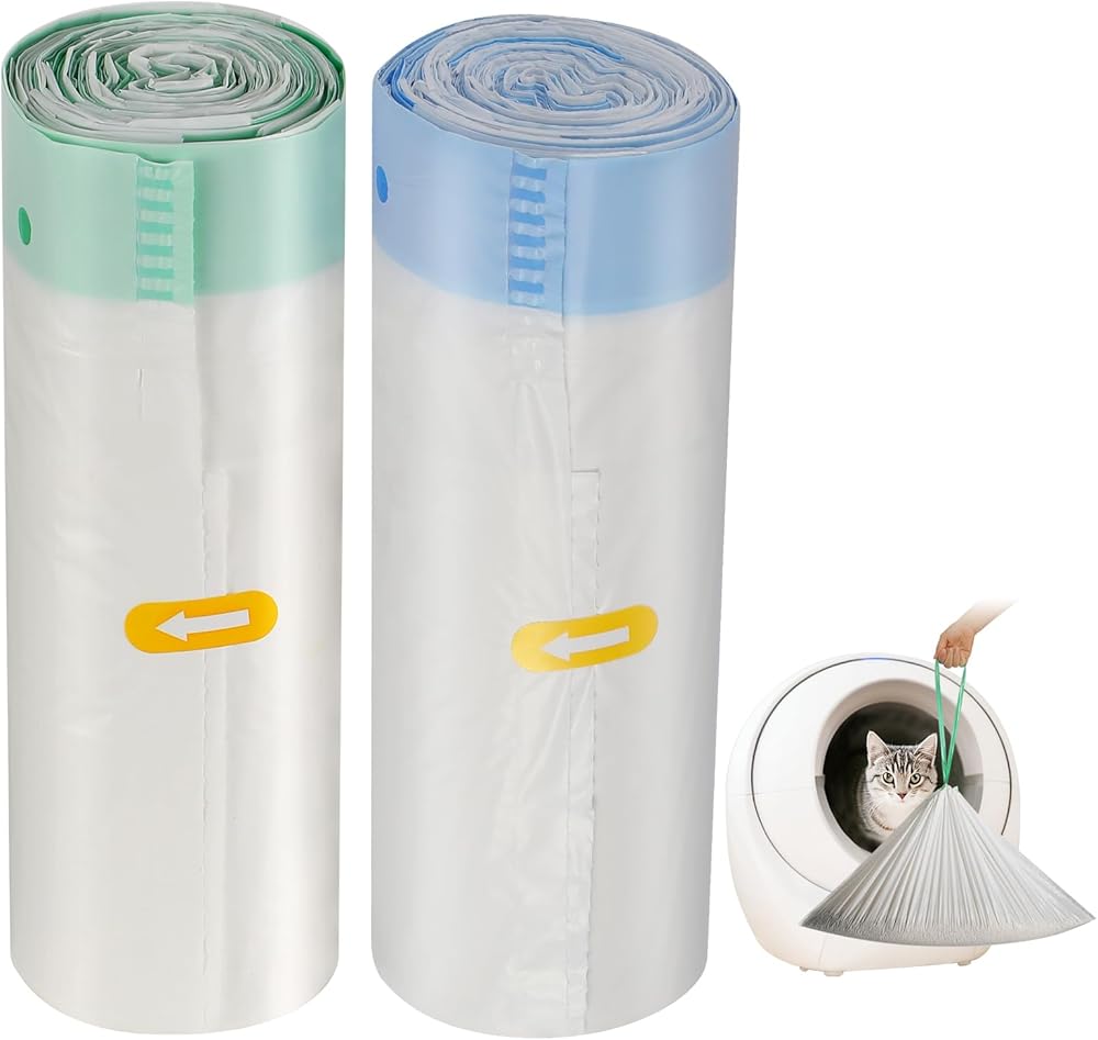 EASY TO PULL ROPE CLOSURE: Cat box liners adopts a convenient pull rope design for safe tying. The cat litter liner has dividing lines that can be quickly and effectively torn off from the reel
