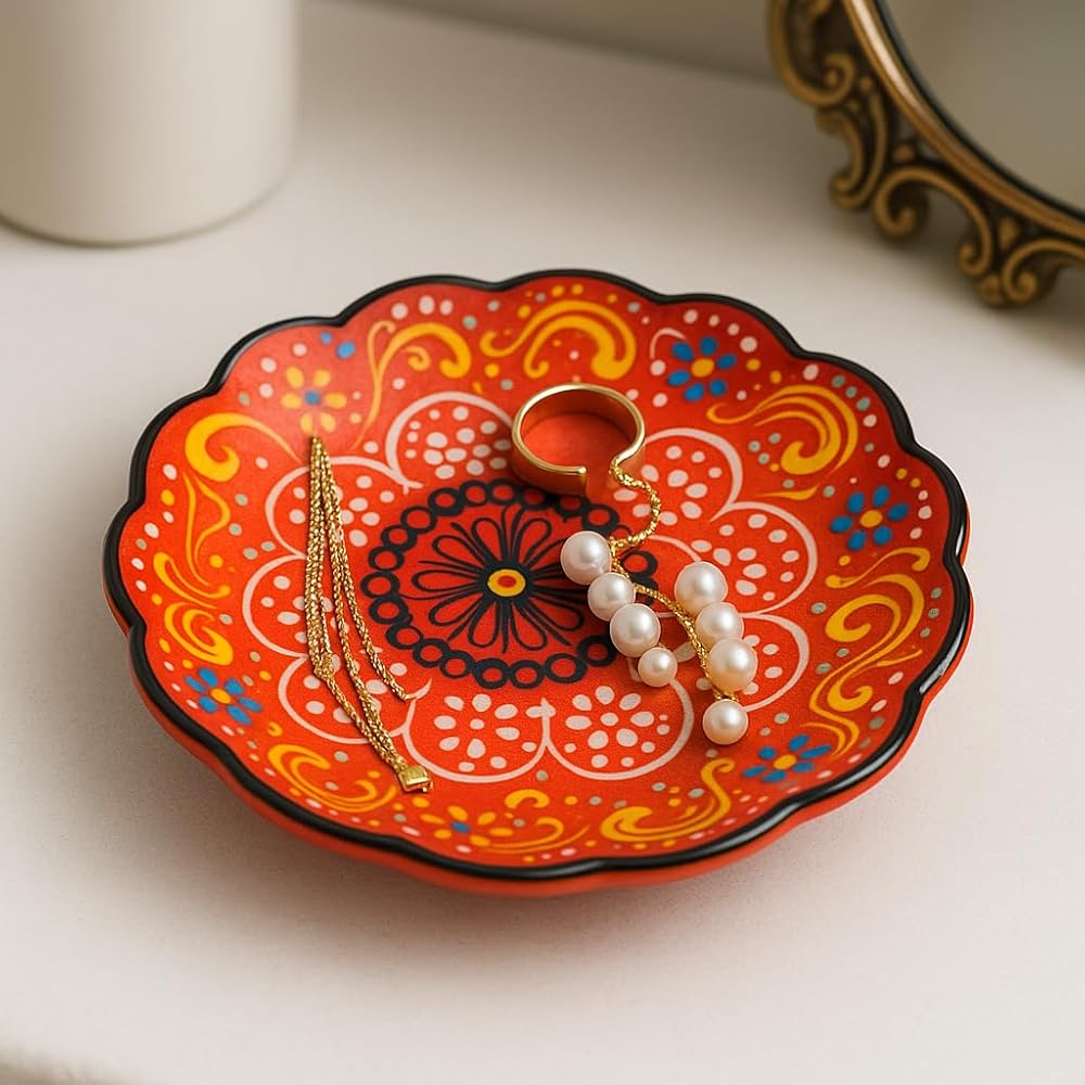 Multi-Purpose Decorative Set - This 4-piece set of handmade Turkish ceramic plates serves as both beautiful wall décor and elegant tabletop accents, while doubling as functional jewelry dishes for rings, earrings, and delicate necklaces.