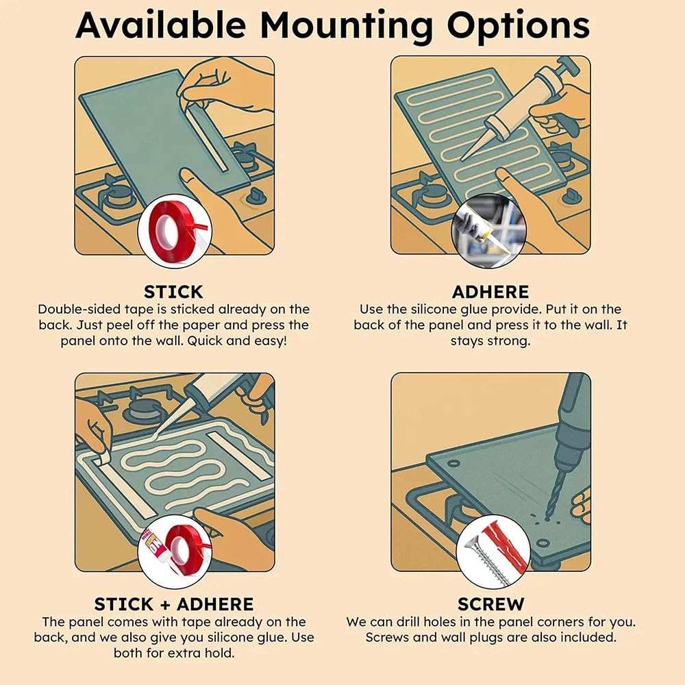 • Easy-to-Clean: Thanks to its fade-resistant smooth glass surface, cleaning the kitchen backsplash is effortless. The backsplash protector keeps your space clean, serving as an artful backsplash for the kitchen wall.