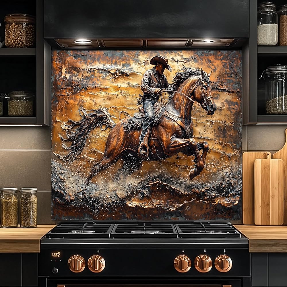 Tempered Glass Backsplash for Kitchen, Cowboy on Galloping Horse Design Glass Backsplash, Copper Look Backsplash for Kitchen Wall, Rustic Kitchen Backsplash, Easy to Install Stove Backsplash