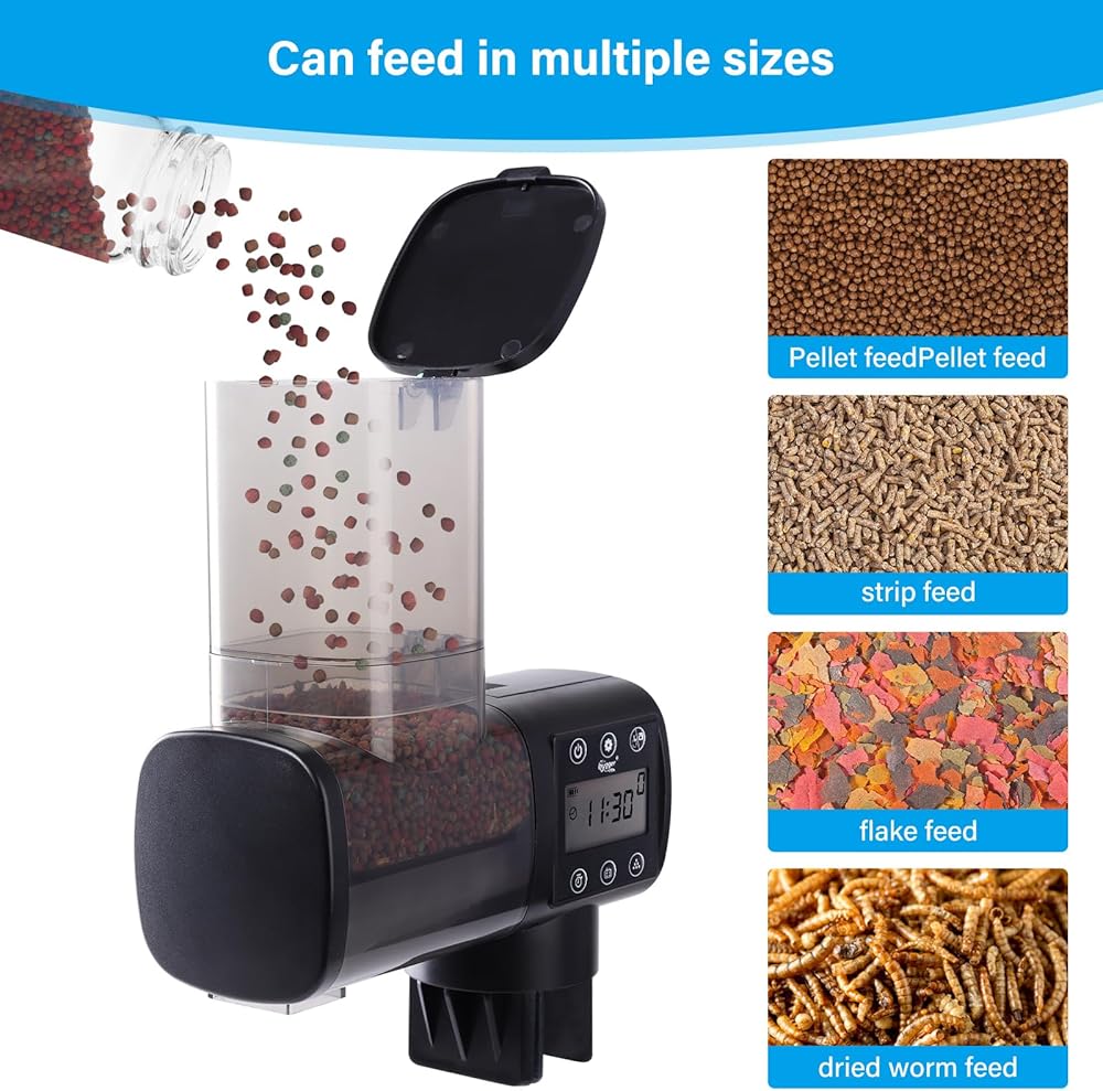 Multi-scene and multi-purpose adaptation:Our Fish feeder Suitable for all kinds of fish tanks, such as fighting fish tanks, water turtle tanks, turtle tanks, large sizes can also be used in small ponds. Whether it is sticks, granules or dry insect fish food, it can be fed smoothly. Convenient and worry-free for daily use, allowing you to easily cope with busy life; it is even more helpful when you go out on vacation during holidays.