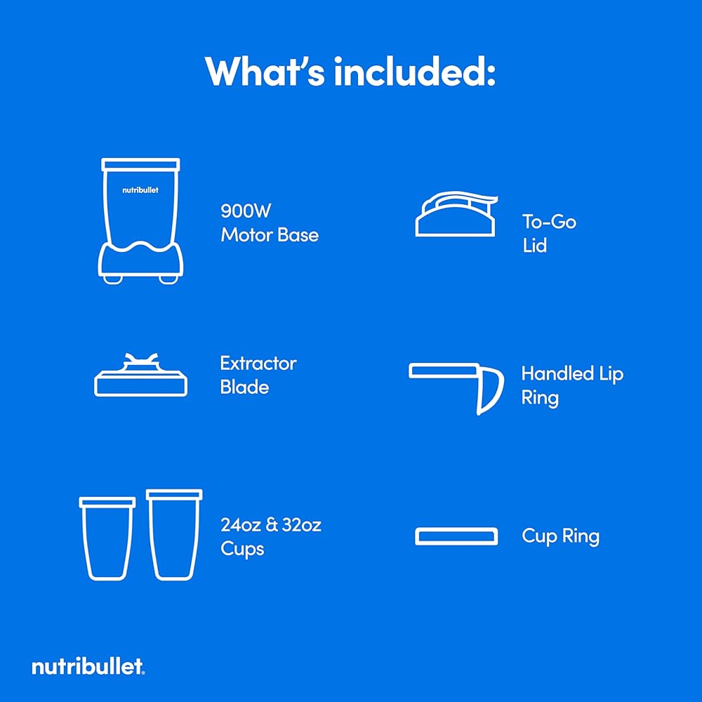 Included: (1) 900W Motor Base, (1) Extractor Blade, (1) 32 oz (900ml) Cup, (1) 24 oz (700ml)Cup, (1) To-Go Lid, (1) Lip Ring, (1) Lip Ring with Handle and User Guide