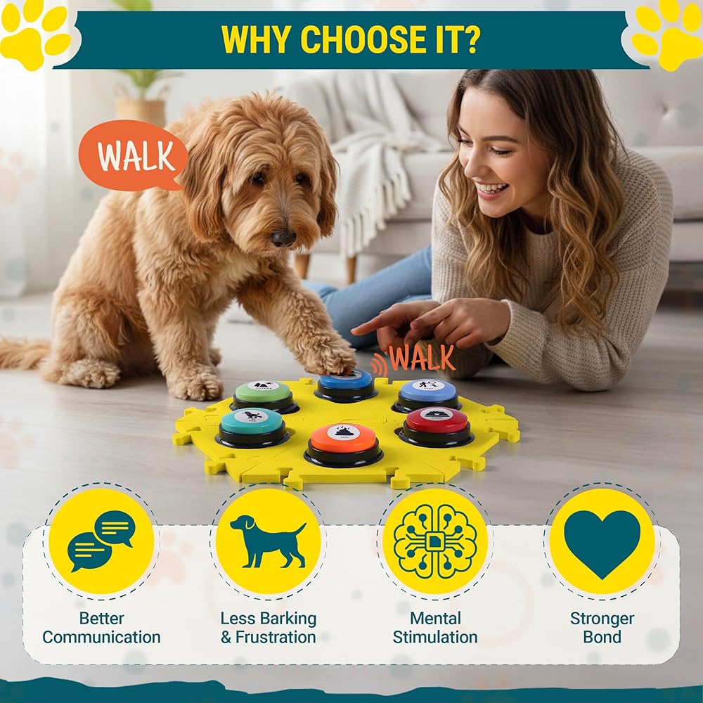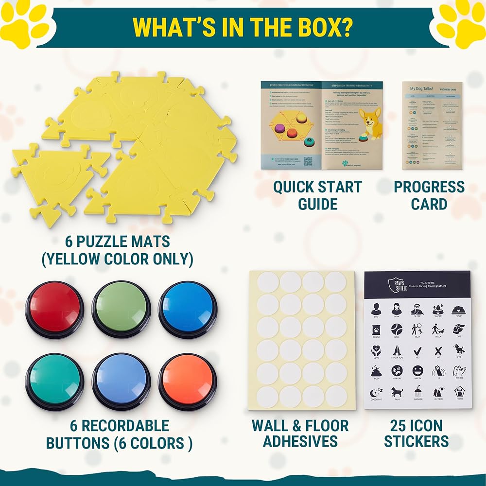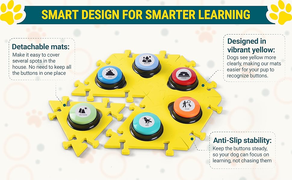 🧩【 Yellow Puzzle Mat 】 Secure & Customizable: Designed to fit your home and your dog's training pace, this yellow mat keeps all the dog communication buttons from sliding. Modular pieces let you arrange them in ways that match your dog's learning style.