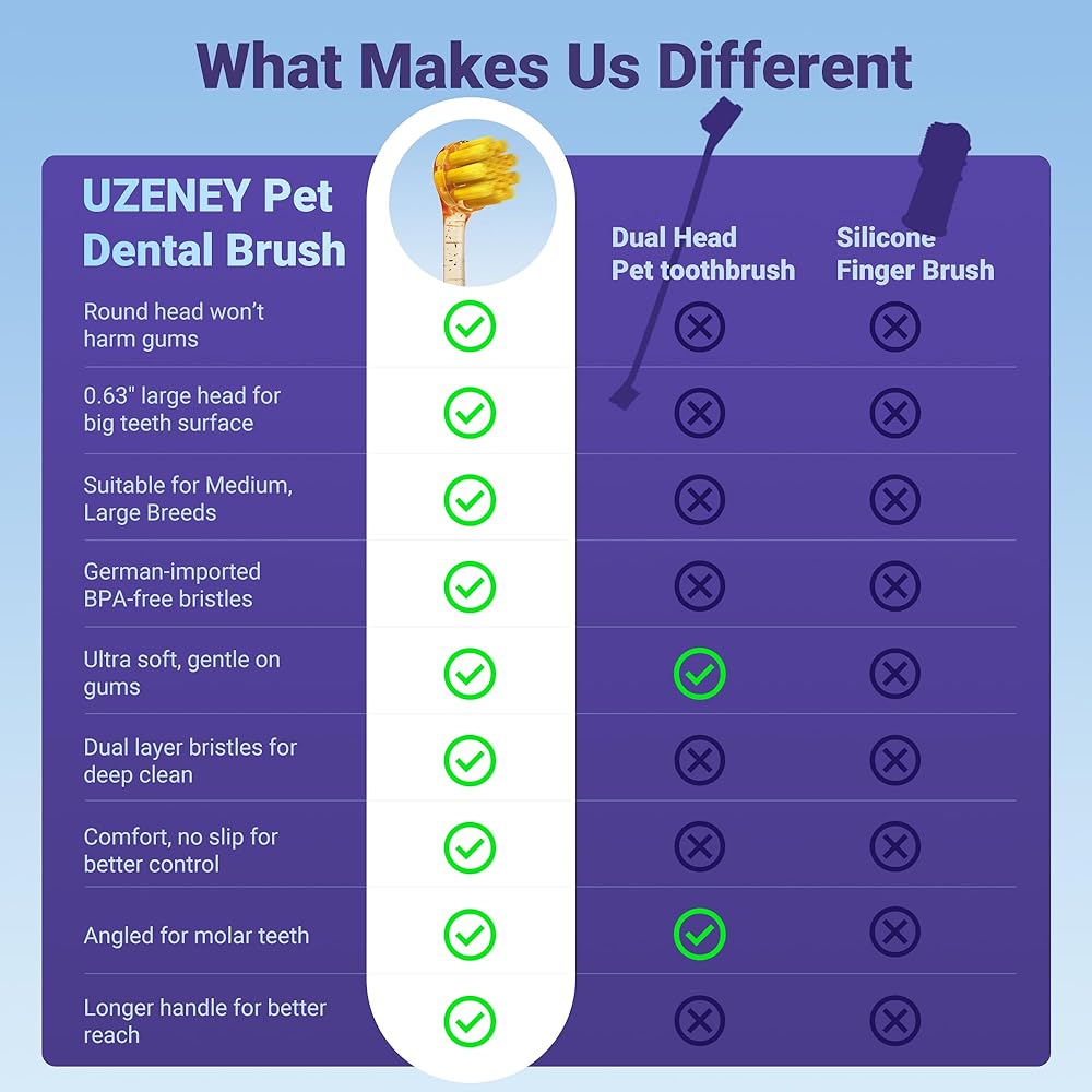 Super Gentle on Gums: Our unique pet toothbrush features german-imported PBT 0.15 mm bristles that are 5 times softer and denser than regular bristles, which are super gentle on gum. The rounded head avoids the irritation caused by 90° angled-edged alternatives. It's perfect for senior dogs or pets with sensitive gums, ensuring stress-free brushing every time.