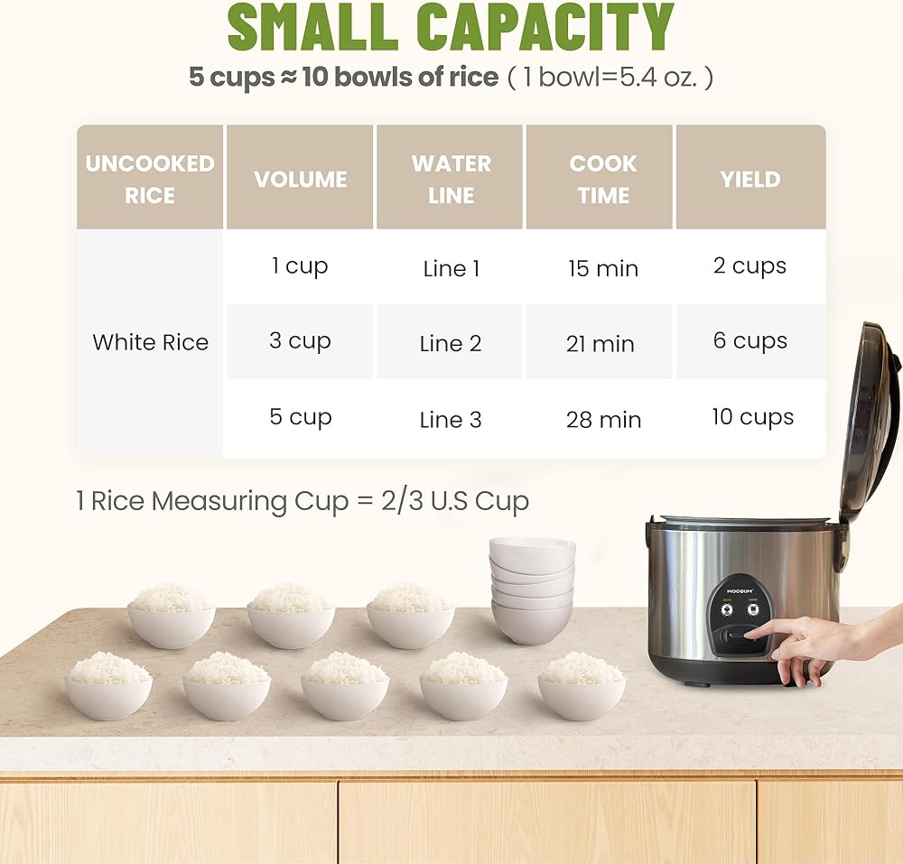 [CAPACITY]:Perfect cooking up to 5-cup uncooked (10-cup cooked) capacity, perfect for individual, growing family, parties or any other activities.