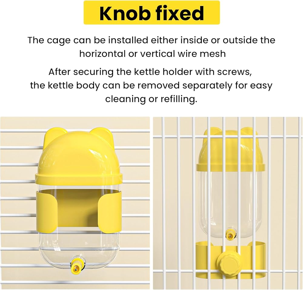 【Easy and simple installation】This small animal waterer simply requires securing the bracket with the threaded knob, then placing the pitcher body into the bracket. It fits most bird cages on the market—whether horizontal wire cages or vertical ones—and can be installed inside or outside the cage as needed.