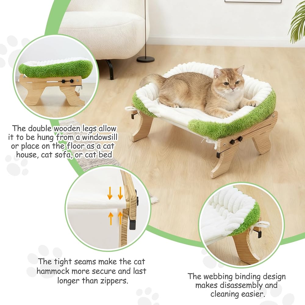 مزايا فريدة: تسمح الأرجل الخشبية المزدوجة بتعليقها من حافة النافذة أو وضعها على الأرض كأريكة أو سرير للقطط. تصميم ربط الحزام يجعل التفكيك والتنظيف أسهل. الدرزات الضيقة تجعل أرجوحة القطط أكثر أمانًا وتدوم لفترة أطول من السحابات. يوفر تصميم الأنابيب الفولاذية دعمًا أكبر وقدرة تحمل أكبر من القضبان الخشبية.