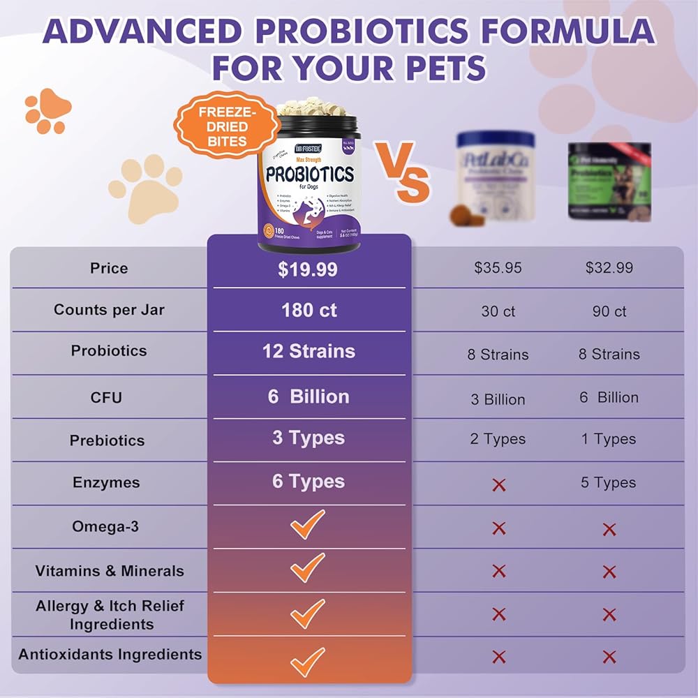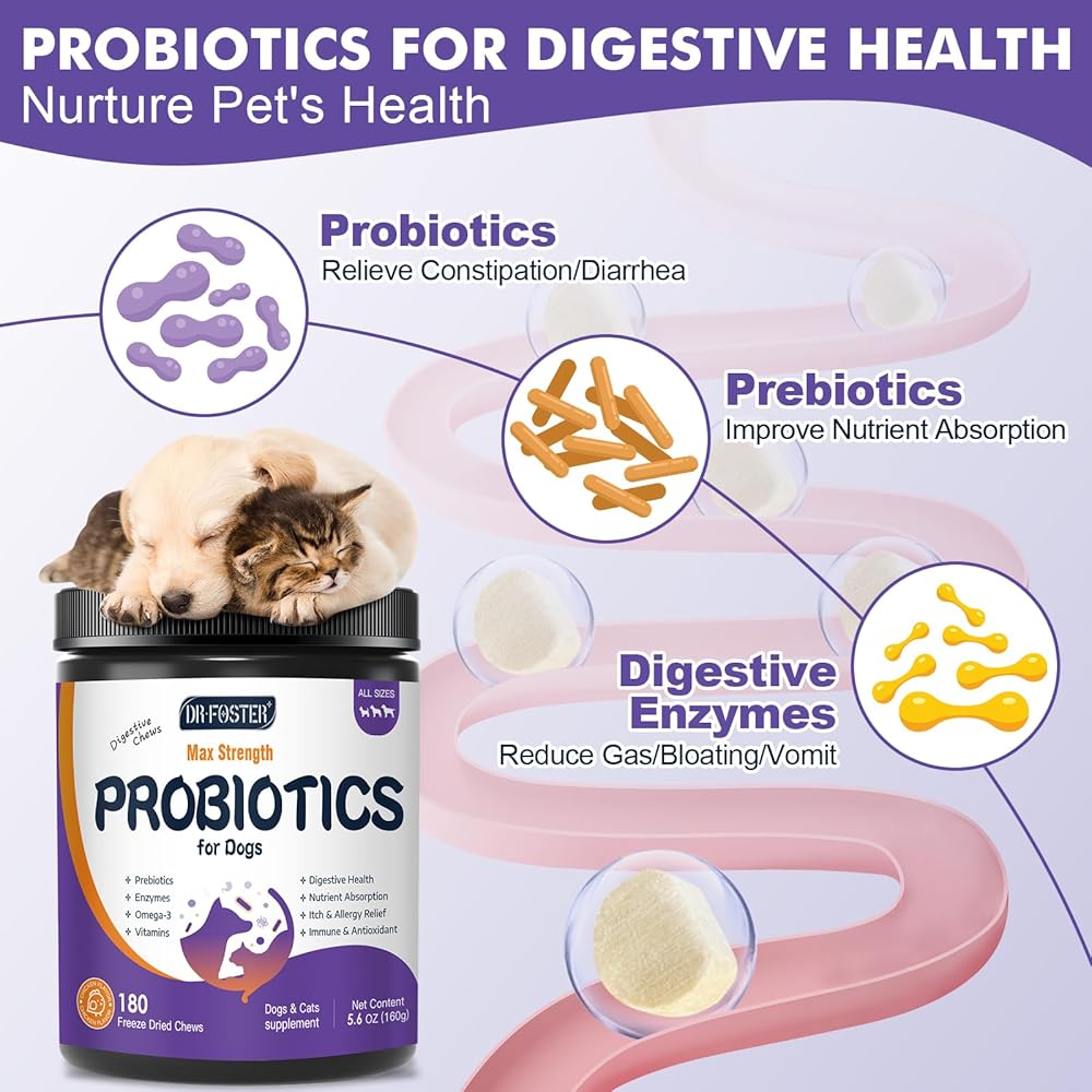 DRFOSTER Probiotics for Dogs, Freeze-Dried Dog Probiotics and Digestive Enzymes, Plus Omega-3 for Itchy Skin, Prebiotics for Digestive Health, Dog Vitamins and Supplements for Immune Health, 180 Bites