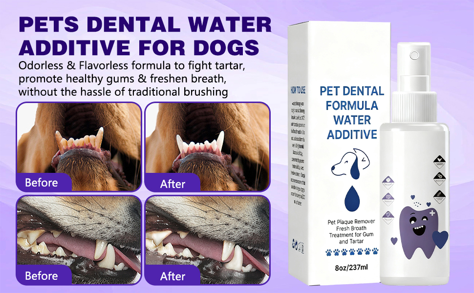 Odorless and flavorless solution: Our for pet dental water additive for dogs is completely odorless and flavorless, making it perfect for picky eaters! your furry friend won't even notice it's there, Allowing for stress-free dental care at home