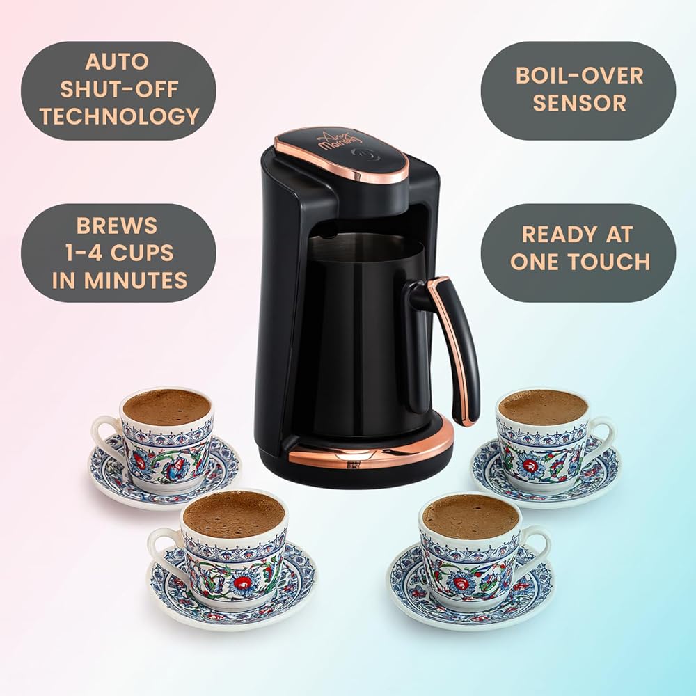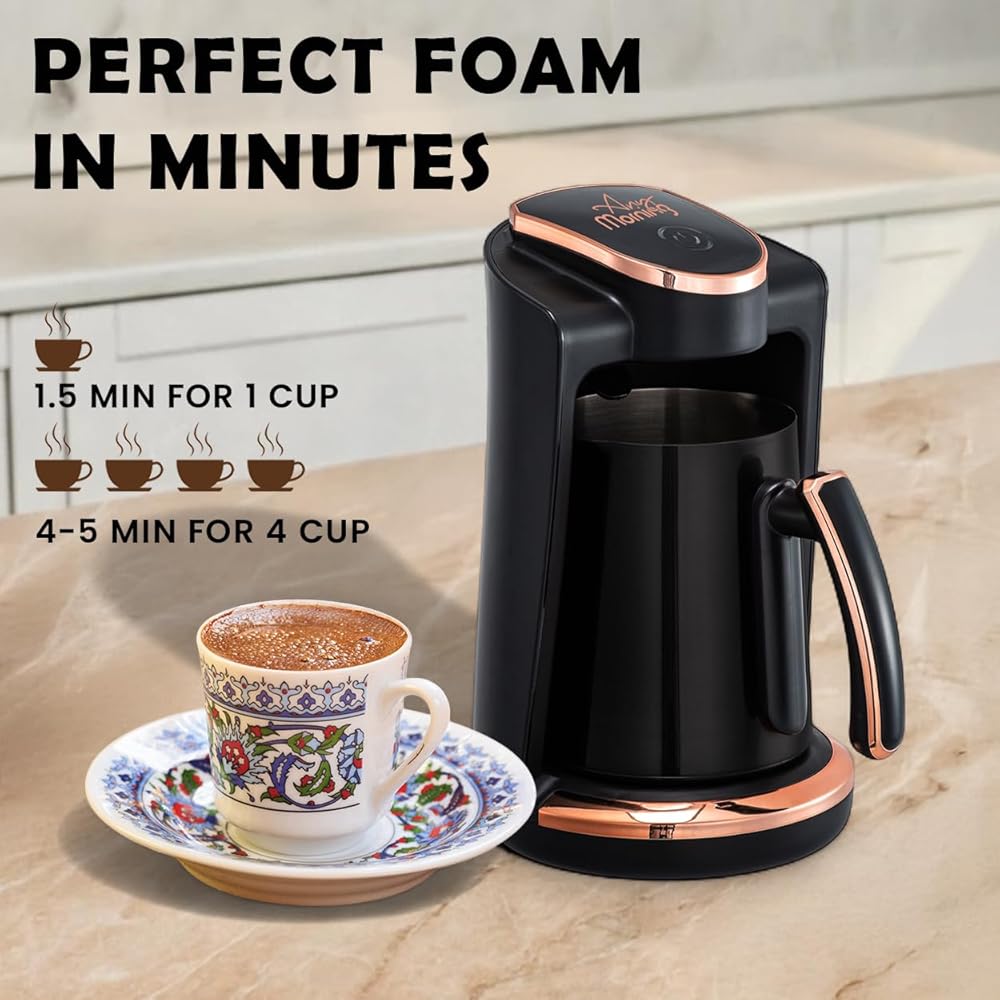 Bring the rich, authentic taste of traditional Turkish and Greek coffee to your home or office with the Any Morning LI23201S Electric Coffee Maker. Designed for 1–4 cups (250 ml capacity), it delivers a perfectly foamy, aromatic coffee that mimics classic stovetop brewing. Equipped with Cook Sense Technology, this smart coffee maker detects when your coffee foam reaches the ideal level, so you can enjoy rich, foamy coffee without constantly monitoring the machine. Its automatic shut-off and heat protection features ensure safe and energy-efficient operation, while the durable stainless steel pot is 100% BPA-free and easy to clean. The ergonomic dual-spout design suits both right- and left-handed users, and its compact footprint makes it perfect for small kitchens, countertops, or office spaces. With 400W power, brewing is fast, efficient, and convenient—making it the perfect choice for daily coffee lovers. Whether for personal use or as a thoughtful gift for coffee enthusiasts, the Any Morning LI23201S offers a modern, convenient, and authentic Turkish coffee experience at home, every time.