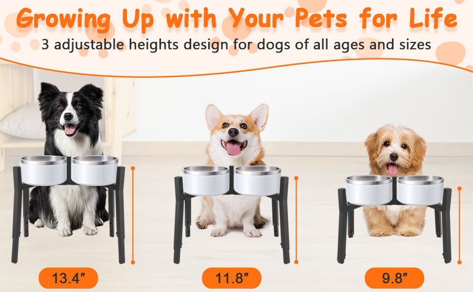 ALL-BREED APPLICABILITY: The dog bowl stand is sturdy and durable as it's made of premium metal and coated with safe, non-toxic rust-resistant coating. It can accompany pet from puppy to full grown. The stand comes with 3 adjustable heights (9.8", 11.8", 13.4") to provide a comfortable and healthy eating height for your dog, which helps to reduce stress on their neck, joints and muscles