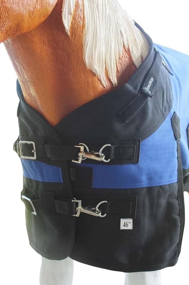 ✔ HEAVY-DUTY: 1200 Denier Outer Shell – Made with tough, Rip-stop , Rip-resistant material to stand up to playful foals and active mini donkeys. Waterproof & Breathable – Keeps your animal dry in wet conditions while allowing airflow to prevent overheating. Fully Adjustable Fit – Includes adjustable front closures, belly straps, and leg straps to ensure a secure, customized fit as your foal or mini grows. ️ 250 GCM Superior Insulation – Offers just the right amount of warmth for chilly weather without adding bulk or causing discomfort. Soft Inner Lining – Smooth lining helps reduce rubbing and protects delicate skin and coat. Reinforced Stitching – Designed with durability in mind, featuring strong stitching for long-lasting performance through daily wear. Tail Flap for Added Coverage – Helps shield your foal's hindquarters from wind, rain, and cold temperatures. ⚡ Quick & Easy to Use – Equipped with user-friendly buckles and straps for fast on/off—ideal for busy barn routines. Specially Sized for Foals & Minis – Tailored fit for newborn foals, miniature horses, and mini donkeys, ensuring comfort and freedom of movement. Elasticized Belly & Leg Straps – Flexible straps keep the blanket in place without constricting movement, allowing foals to run, lie down, and play naturally. Tail Flap Design – Extra rear coverage to block wind and rain from the hindquarters, helping to regulate temperature and protect delicate areas. Reinforced Stitching & Binding – All seams are double-stitched and reinforced to extend the life of the blanket through daily wear and washing. SIZING CHART: Small(46"- 47"), Medium (48"- 51")Large(52"- 53"), XL(54"- 56")