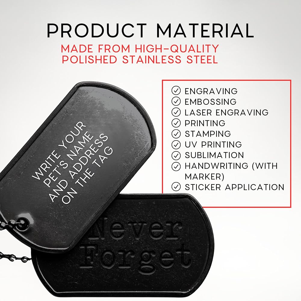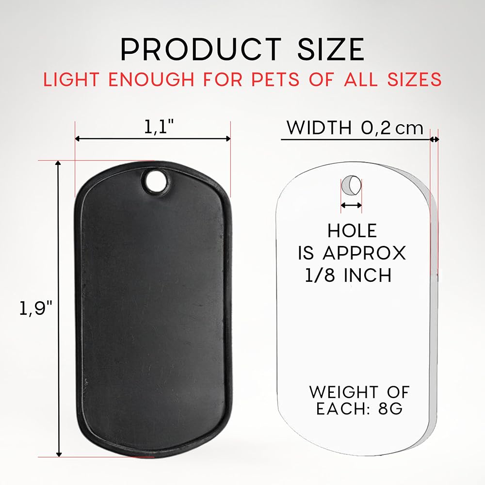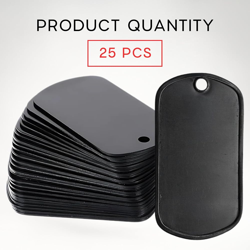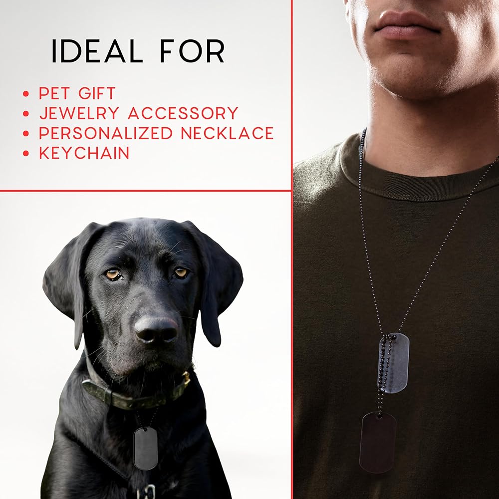 Upgrade your craft and identification projects with this 100-pack of premium stainless steel dog tags. Each tag is precisely cut to 1.9 x 1.1 inches, offering a smooth surface ideal for engraving or laser etching. Whether you need dog tags military style for events, dog name tags engraved for pets, or you're designing a personalized gift, these blank dog tags for engraving are designed to meet the task with durability and style. Their matte black finish is not only visually striking but also perfect for sublimation, making them ideal dog tag sublimation blank units for custom graphics or text. The high-quality stainless steel resists rust and wear, offering lasting clarity for your personalized military dog tags or metal dog tags projects. Use them for DIY crafts, military tributes, team giveaways, or as dog tags for costume pieces for events and cosplay. Looking for bulk military dog tags or dog tag necklace blanks? This set is exactly what you need. It also suits a wide range of personalization—from dog tags sublimation blanks to blank metal keychains for engraving, allowing endless possibilities. Choose a reliable, versatile, and value-packed solution. Whether you're creating dog tag blanks for laser engraving or gifting dog tags army style souvenirs, this set delivers. Grab yours now and start engraving your next masterpiece!