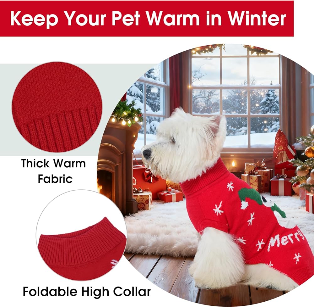 Foldable High Collar: The dog christmas outfit is designed of turtleneck, which provides additional warmth for your dog's neck and can be worn up for extra coziness or folded down for a more relaxed fit. The collar and cuffs of the dog sweaters for small dogs are stretchy and soft, easy to wear and take off.
