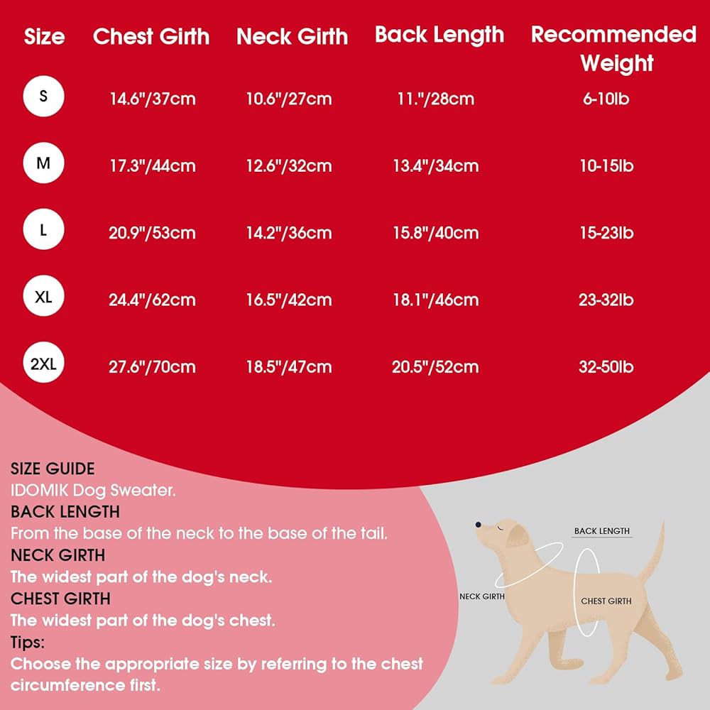 Multiple Sizes: The christmas dog sweater dogs has 5 sizes in each color, S-2XL, suitable for small medium large dogs such as French Bulldog, Dachshund, Pug, Labrador, Golden Retriever etc, not suitable for extra large dogs. Please check the size information carefully before you ordering the dog sweatshirt.