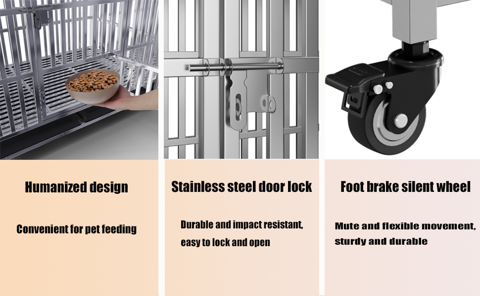 [Effortless Assembly & Quick-Clean Design]This dog crate most of the parts are pre-assembled, fitted with four wheels, movable rods and trays, and can be completed in just 5 minutes with no tools required.The removable bottom pallet make clean up more conveniently.Dog parenting can be challenging, but this crate turns those struggles into stress-free moments - your ultimate partner in creating paw-friendly routines.