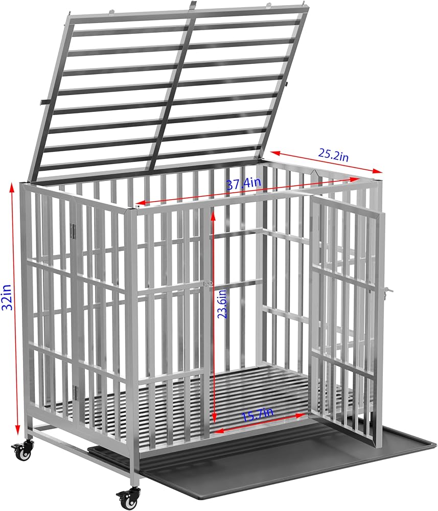 37" 42" 48" Heavy Duty Dog cage Stainless Steel Metal Kennel and Crate, Collapsible for Medium to Large Dogs, Easy to Assemble pet Pen with Four Lockable Wheels, Black Tray(37in)