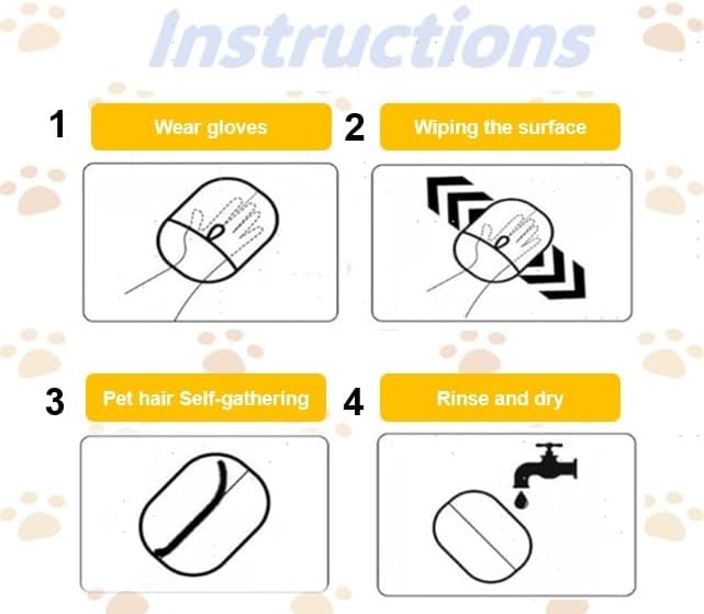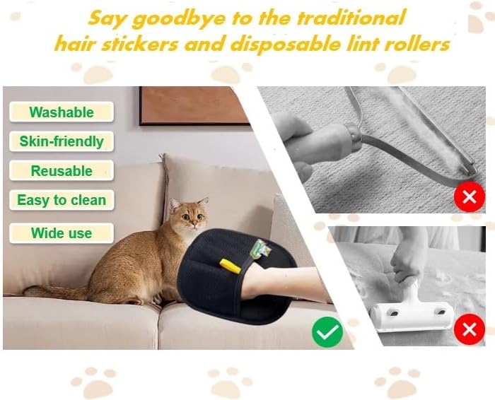 Farewell to the traditional sticky rollers! This new pet hair remover glove is the perfect tool for every pet parent, no matter whether you are a dog mom or a cat dad! Why Choose Us? Eco-Friendly: Comparing with the traditional sticky rollers, this glove is reusable and washable. It's the perfect sustainable cleaning solution that saves money and reduces environmental impact. Multi-functional: This static removal glove can be used for combing, cleaning and bathing. This glove is not only suitable for cats, but also for other pets, and suitable for pets of varying hair lengths. Comfortable Wear: This pet grooming gloves can help remove dirt and loose hair on your pet's body. The breathable mesh holes ensure a gentle yet efficient grooming experience. Easy-Cleaning: This static removal glove can easily lift lint, pet hair, and dust with gentle left-to-right strokes. It covers more surface area in less time. How to Use: Step1. Wearing gloves: Wear them on your hands as you would wear regular gloves, ensuring the fingers are fully covered to better control force and direction. Step2. Wipe the surface: Slide the gloves back and forth " left and right" Step3.Collecting hair: Pet hair and debris will gather into a long "cat strip" that can be removed easily. Step4.Cleaning gloves: Take off the gloves and rinse the surface with water. Let it dry naturally.