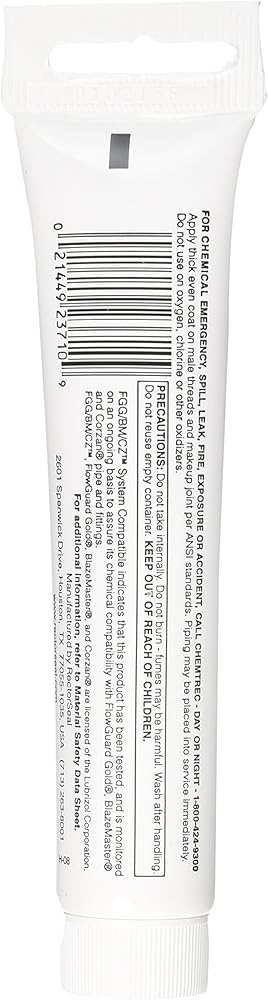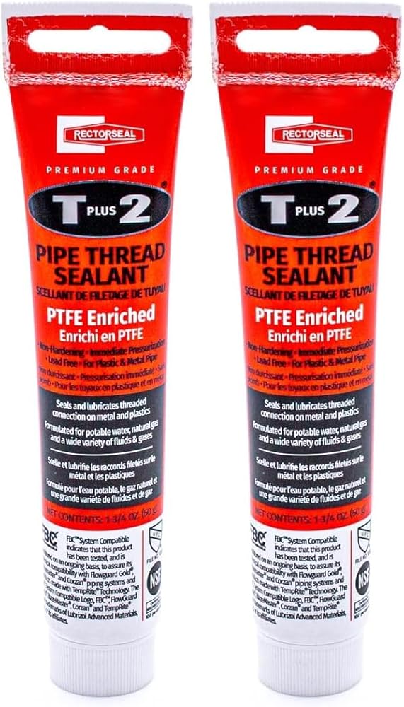 - Non-hardening thread sealant containing PTFE plus synthetic fibers
