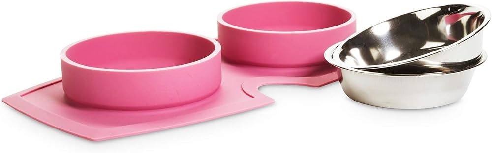 The EveryYay Better Together Silicone Double Diner with StainlessSteel Bowls keeps their food and water all in one place. Including 2 stainlesssteel bowls, this double diner is designed with a flexible silicone base to help contain mealtime messes. You can also pop the set right into the dishwasher to keep their dinner table nice and clean between feasts.