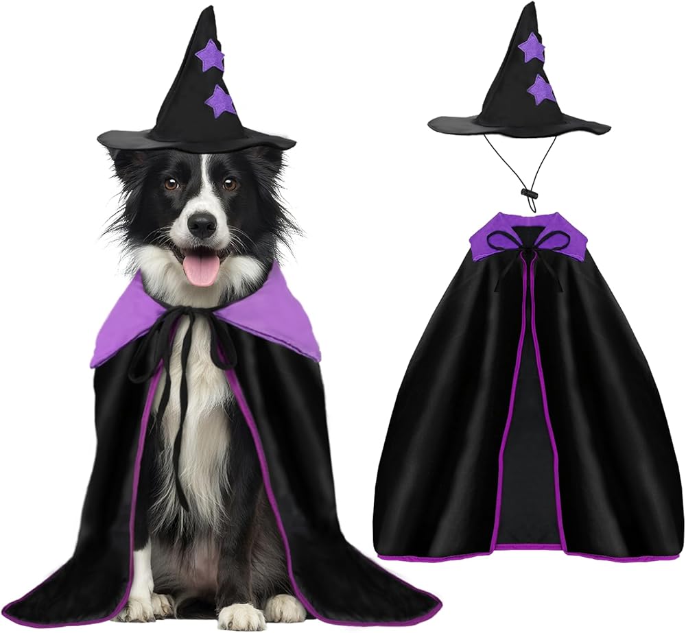 Dog halloween costumes: You will receive a mesmerizing purple pointed wizard hat adorned with purple stars, paired with a lightweight and elegantly tailored purple witch cloak; When your pet wears this magical costume, it can be enveloped in this enchanting magical atmosphere, emitting a magical charm that is both captivating and enchanting