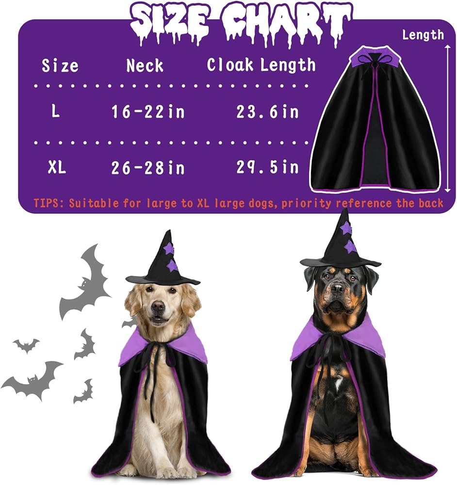 Adjustable size: Our dog witch costume comes in two lengths of 60 and 75CM, suitable for dogs with neck circumference between 40-70CM; The wizard hats in the two sizes of witch cape are of the same size, suitable for head circumference between 20-50CM; The elastic rope and buckle design of the witch hat can be better adjusted to fit your dogs; Please measure the neck circumference and back length of your dog before placing an order