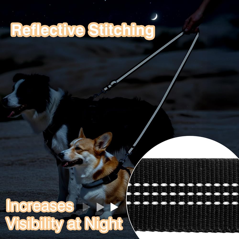 3. The no-tangle design of the double dog leash includes reflective stitching for enhanced visibility during nighttime walks.