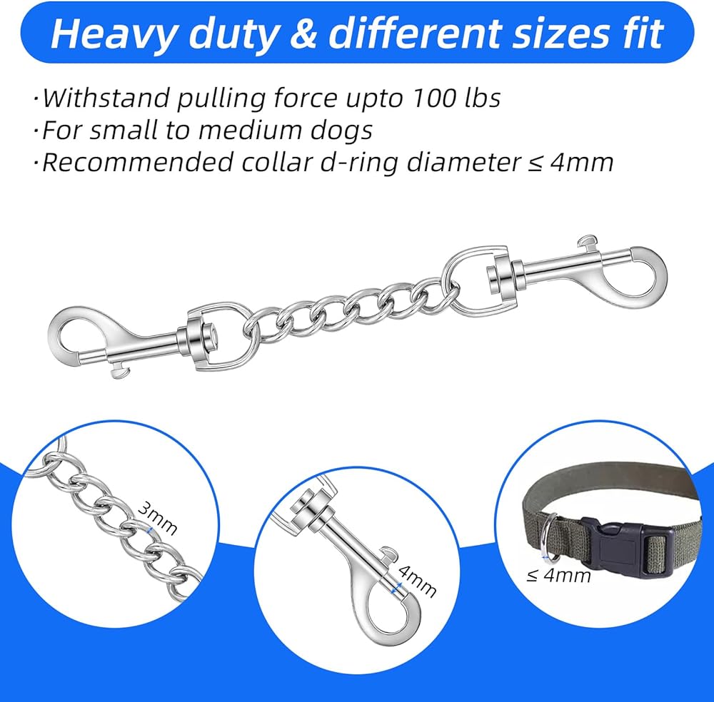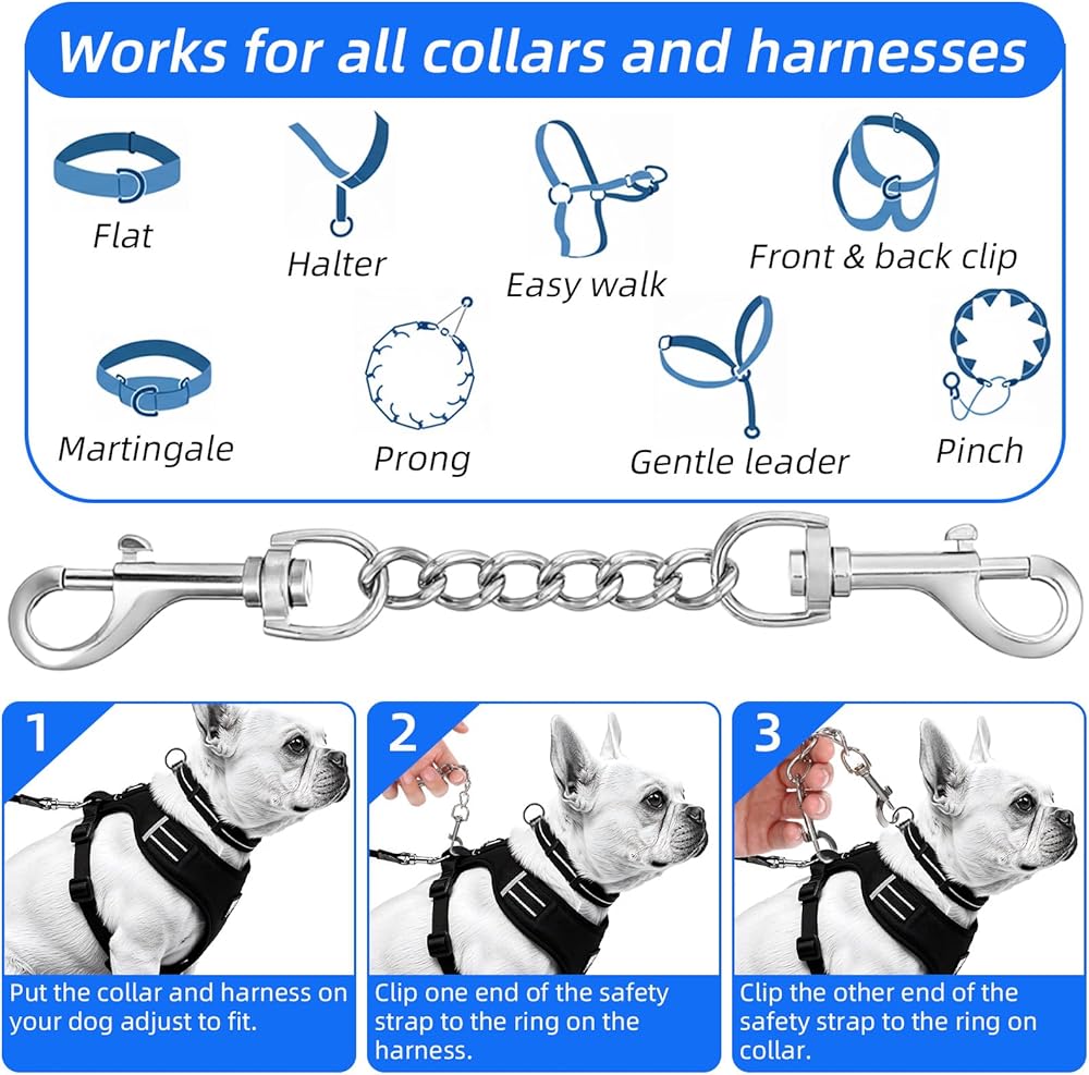 Dog Collar Safety Clip Stainless Steel Dog Collar Backup Strap Harness Collar Leash Chain Connector Heavy Duty Double End Spring Backup Buckle Clasp Escape Proof Safety Accessory for Dogs