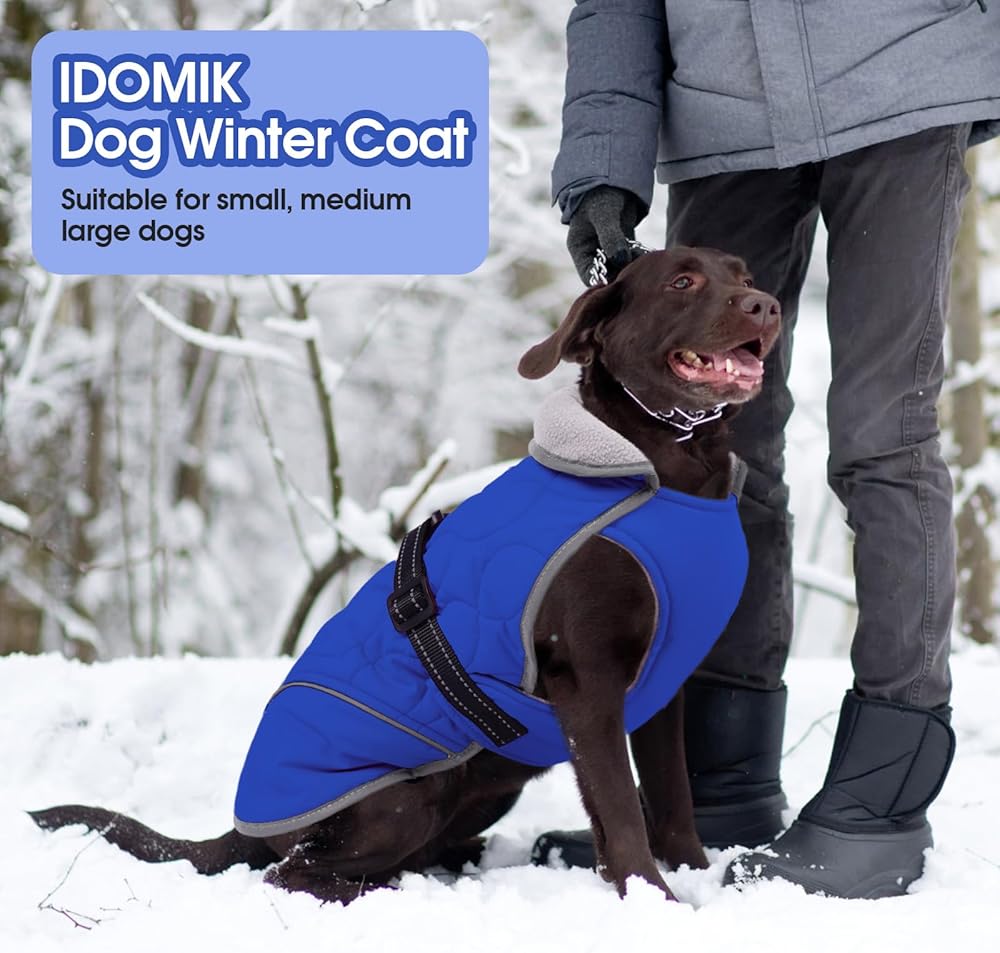 IDOMIK Dog Winter Jacket, Adjustable Waterproof Dog Warm Coat with Fleece Lining, Turtleneck Windproof Cold Weather Coats for Winter, Reflective Warm Snow Jacket for Labrador Golden Retriever,Blue,2XL