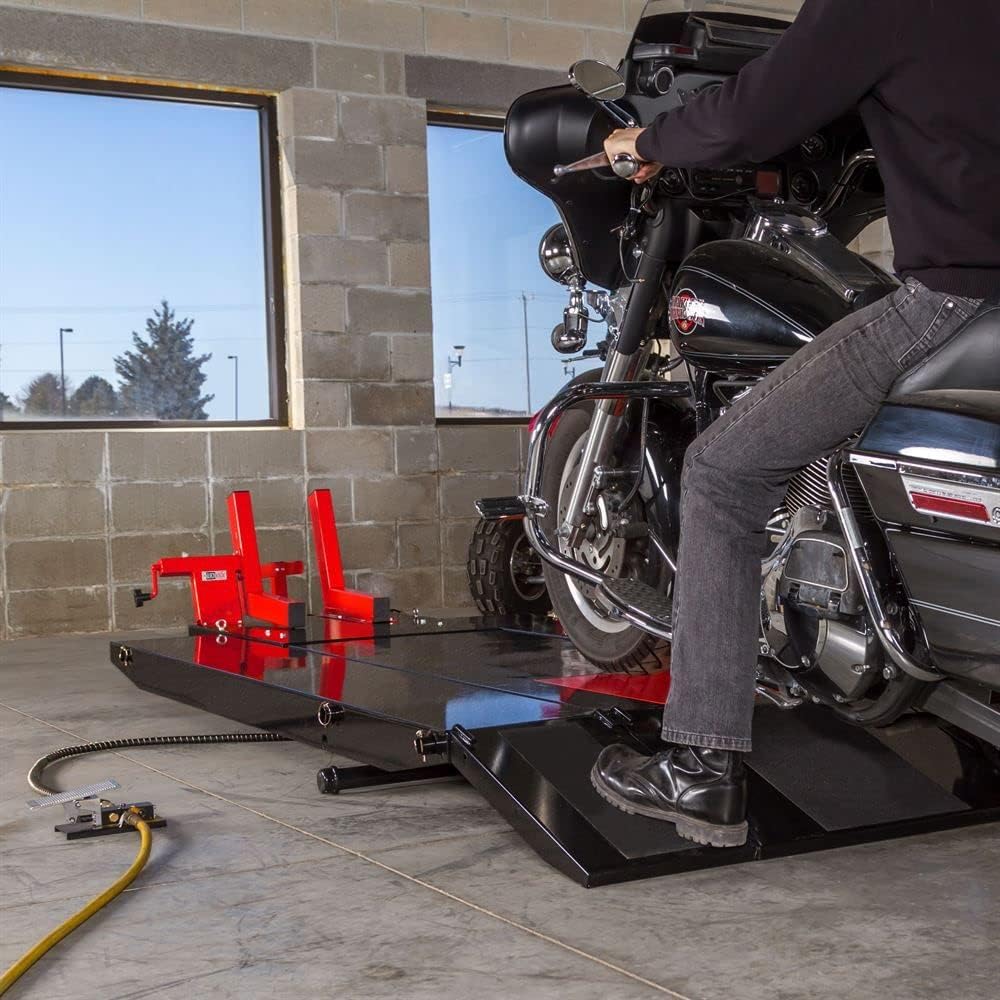PNEUMATIC COMPRESSED AIR LIFT: Foot pedal effortlessly and smoothly raises any motorcycle weighing up to 1,500 lbs. from 7" to 31.25" off the ground; 90-110 PSI required (air compressor not included)