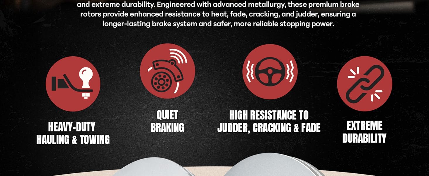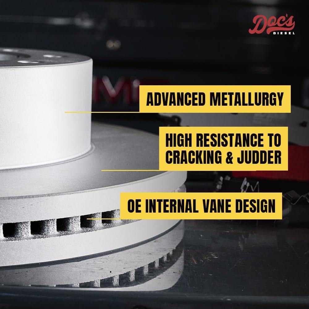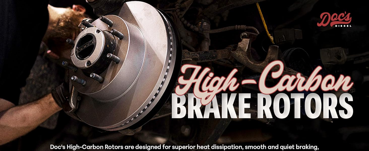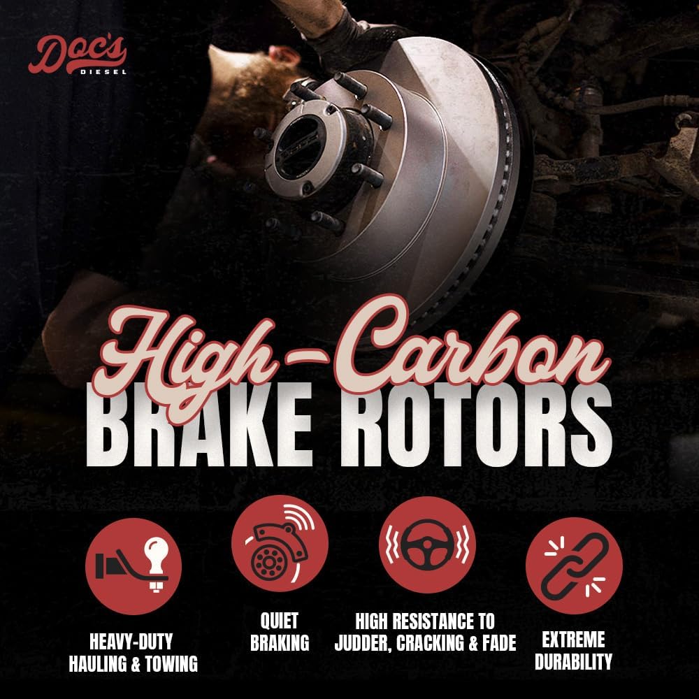 DOC'S DIESEL HIGH CARBON BRAKE ROTOR SET - Doc's High Carbon Brake Rotor Set is designed for superior heat dissipation, smooth and quiet braking, and extreme durability. Engineered with advanced metallurgy, these premium brake rotors provide enhanced resistance to heat, fade, cracking, and judder, ensuring a longer-lasting brake system and safer, more reliable stopping power. With a precise OE fit and machine balancing, they offer easy installation every time.